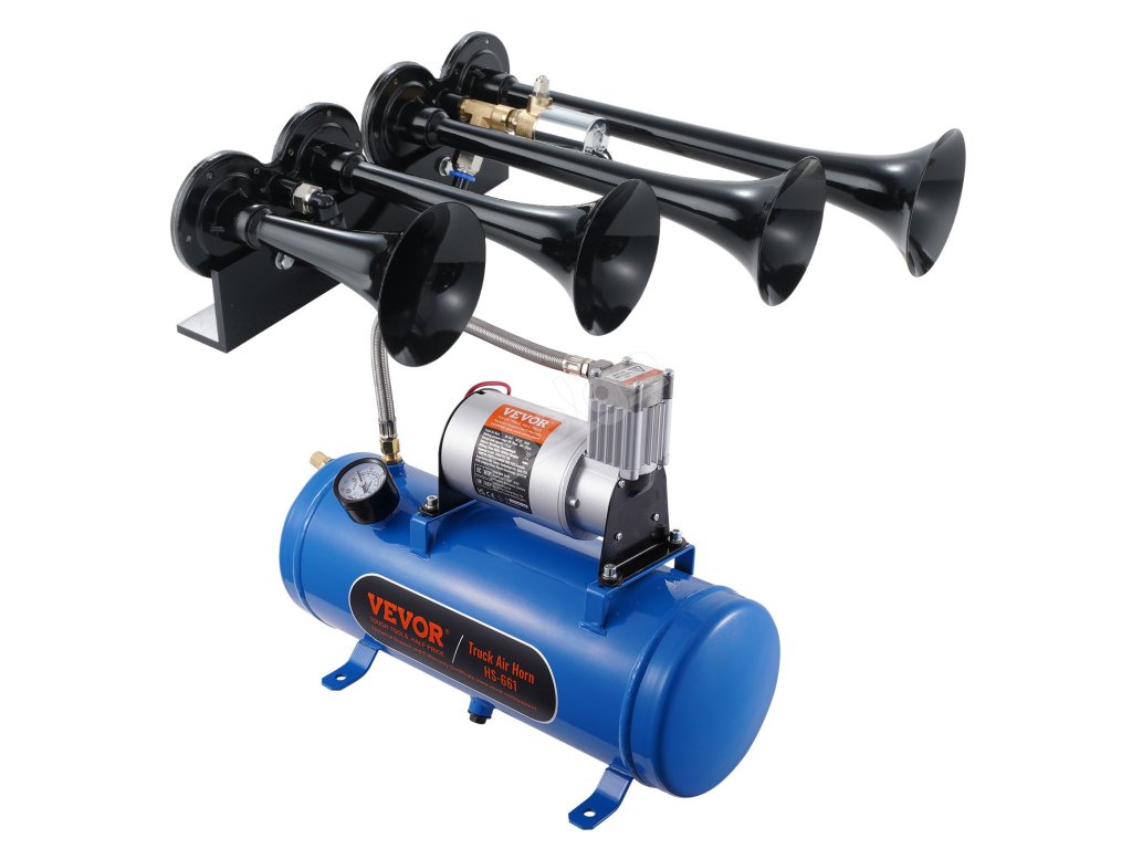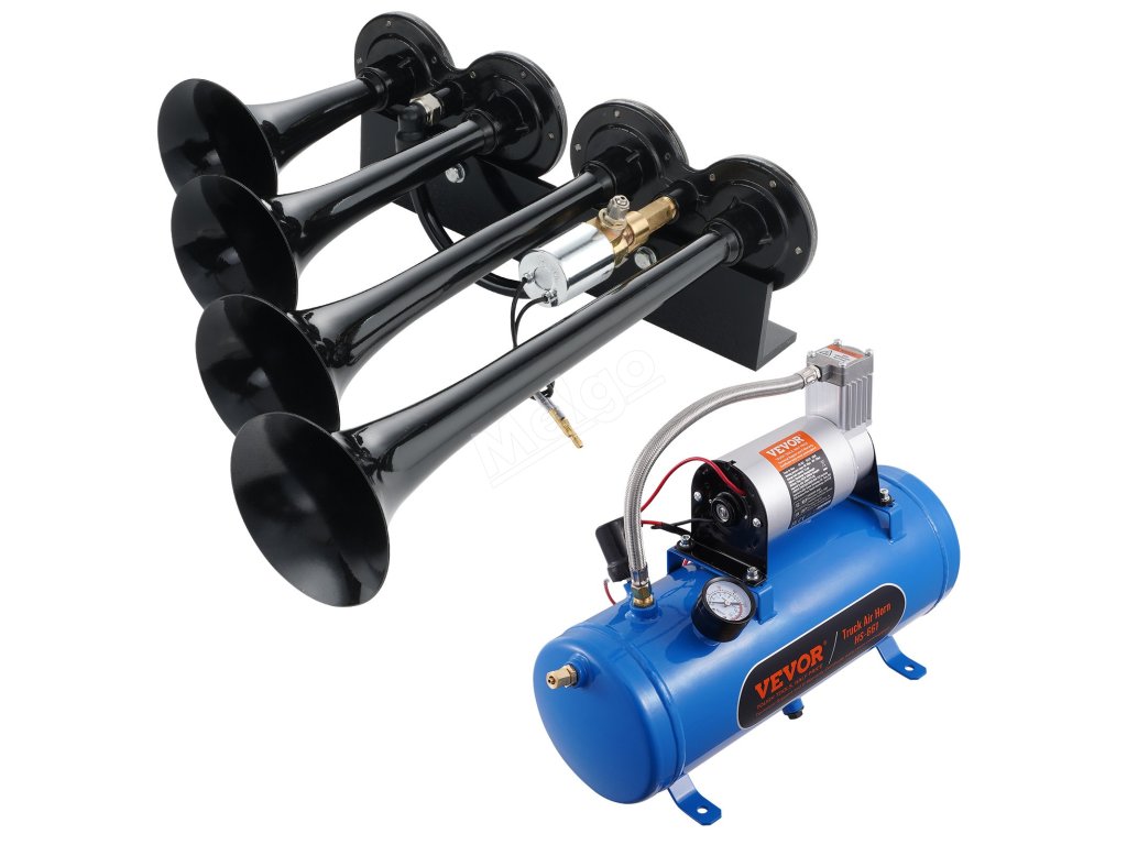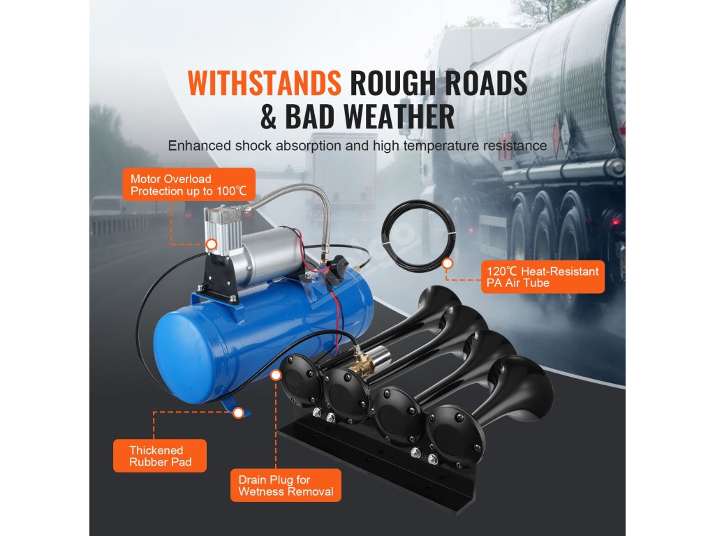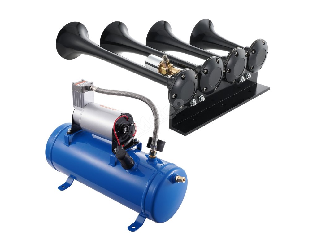 Tato čtyřtrubková sada vzduchového klaksonu obsahuje čtyři klaksony, elektromagnetický ventil, 1,6galonovou nádrž na vzduch, kompresor a vzduchové vedení. Je vybavena kompresorem s automatickým nafukováním pro rychlou odezvu klaksonu. Vyrobeno z materiálů odolných proti korozi. Zajišťuje bezpečnost za každého počasí a účinně upozorňuje ostatní na silnici.