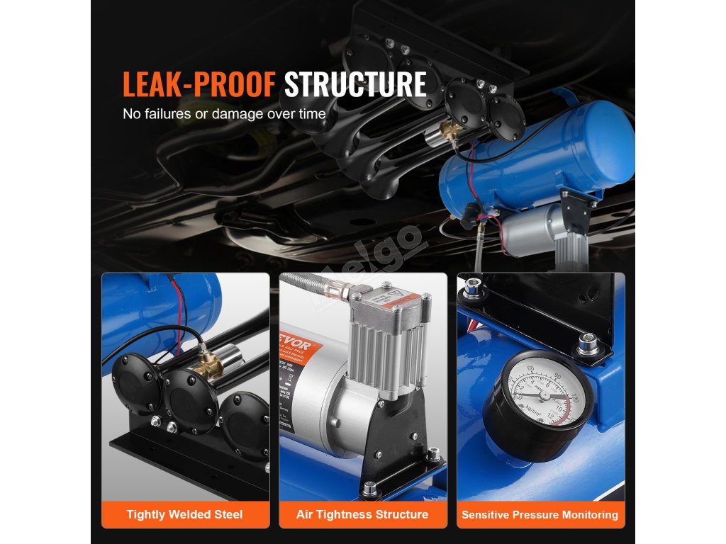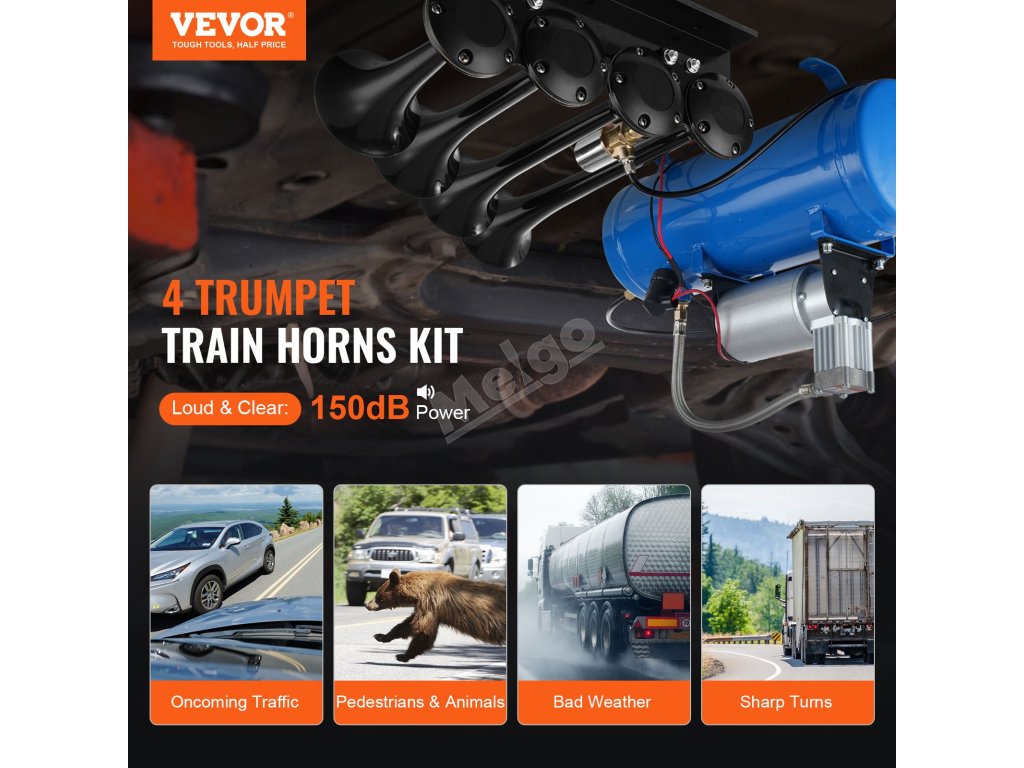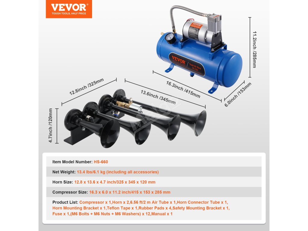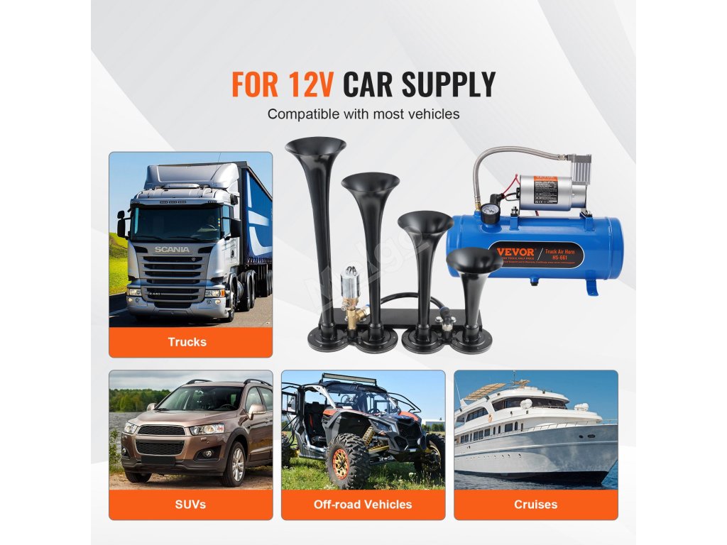 Tato čtyřtrubková sada vzduchového klaksonu obsahuje čtyři klaksony, elektromagnetický ventil, 1,6galonovou nádrž na vzduch, kompresor a vzduchové vedení. Je vybavena kompresorem s automatickým nafukováním pro rychlou odezvu klaksonu. Vyrobeno z materiálů odolných proti korozi. Zajišťuje bezpečnost za každého počasí a účinně upozorňuje ostatní na silnici.