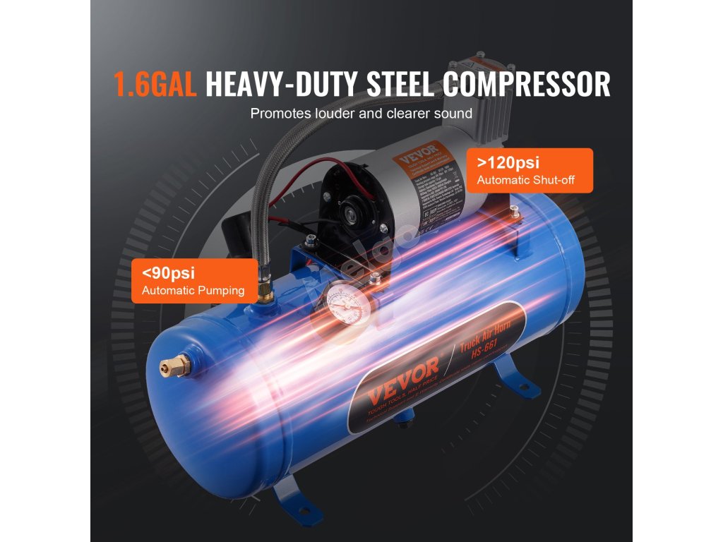 Kompresor pracuje automaticky, nafoukne se, když tlak v nádrži klesne pod 90 psi, a zastaví se při tlaku nad 120 psi, aby se zabránilo přetlakování. Nádrž je monitorována citlivým manometrem a zdokonalená netěsná konstrukce zajišťuje spolehlivou aktivaci klaksonu s minimálním rizikem zpoždění nebo poruchy.