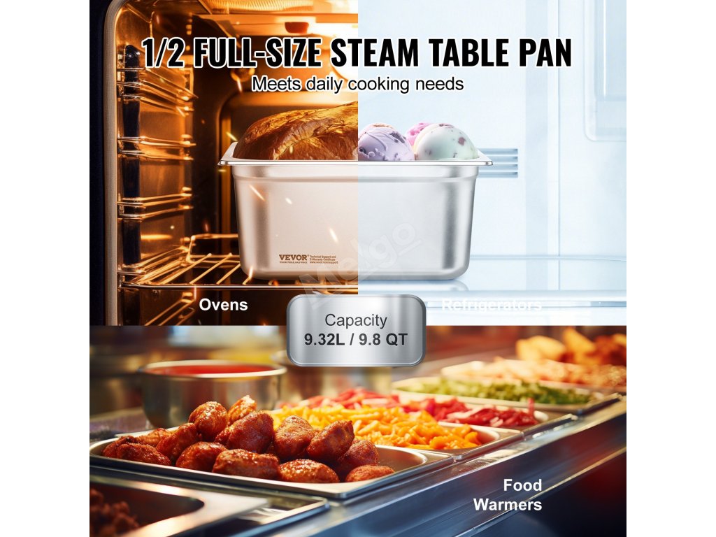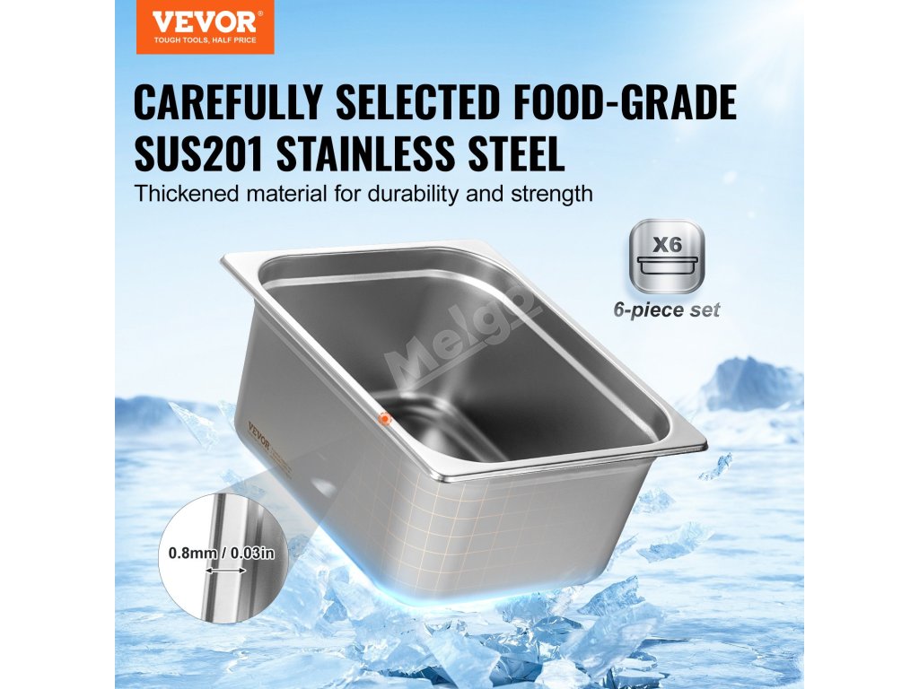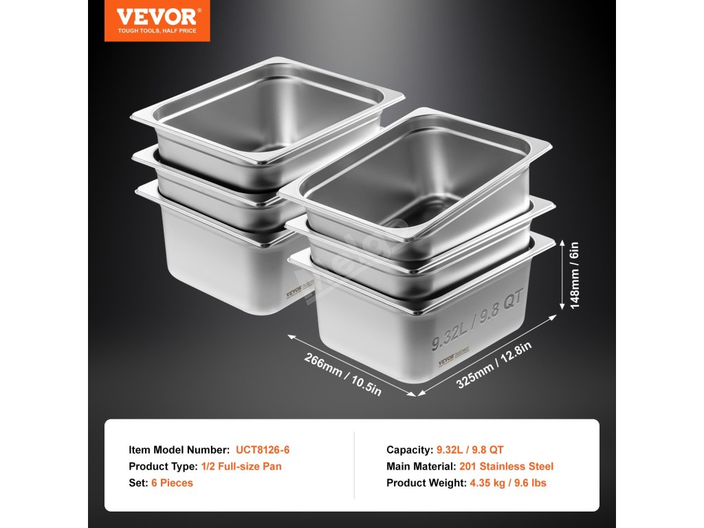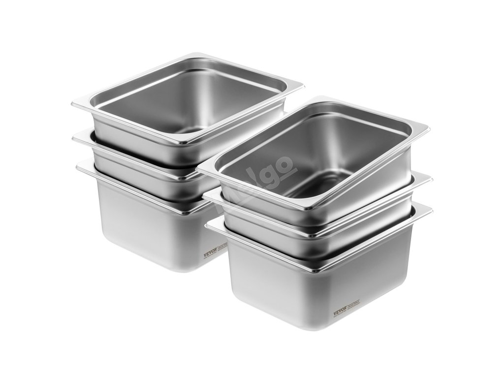6 balení pánví velikosti 1/2, 6 palců hlubokých. Tyto pánve lze použít k vaření, skladování a vystavování potravin.