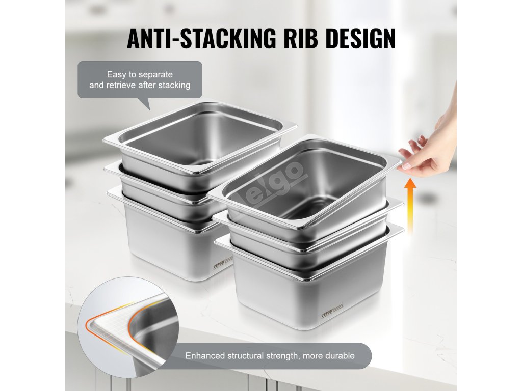 Nerezové hotelové pánve jsou navrženy s drážkami proti stohování, takže je lze při stohování snadno oddělit, a mají zvýšenou konstrukční pevnost pro větší odolnost.