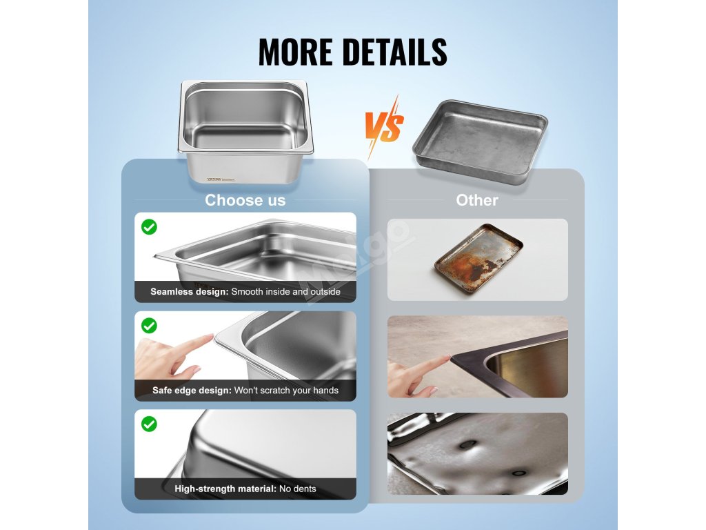 Hotelová pánev je vyrobena z vysoce kvalitní potravinářské nerezové oceli, která odolává vysokým teplotám a mrazu. Jsou vhodné pro trouby, ohřívače parních stolů, chladničky a mrazničky, ideální pro skladování potravin a vaření.