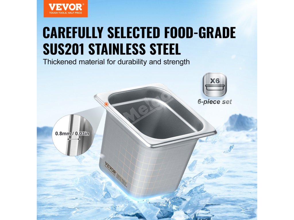 6 balení pánví o velikosti 1/6 a hloubce 6 palců. Tyto pánve lze použít k vaření, skladování a vystavování potravin.