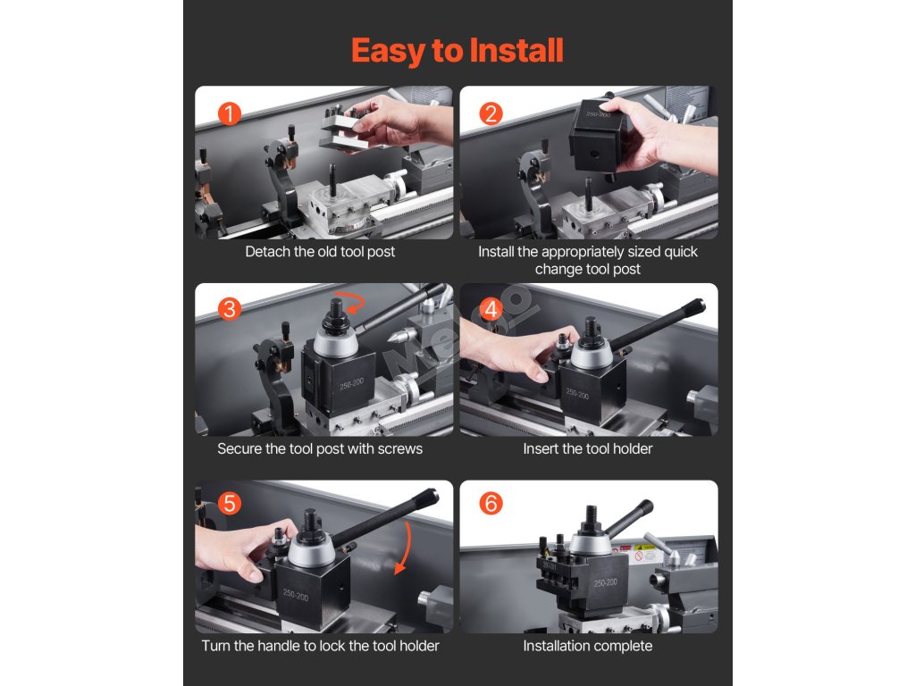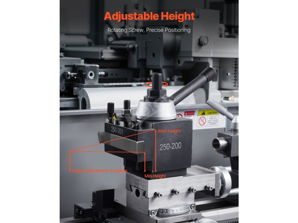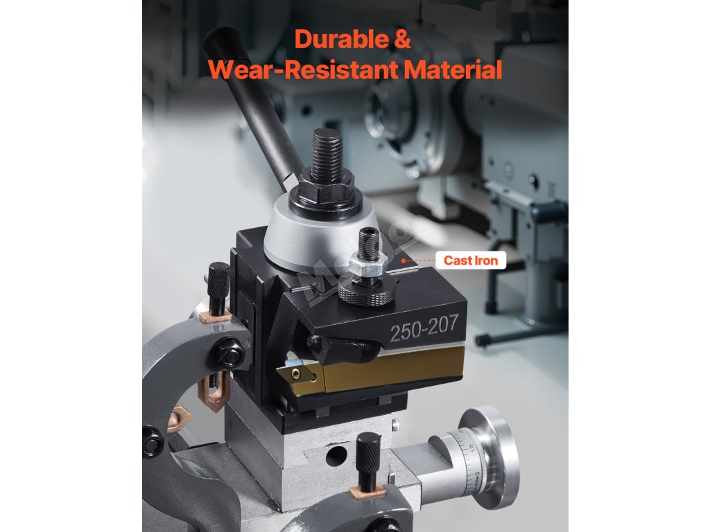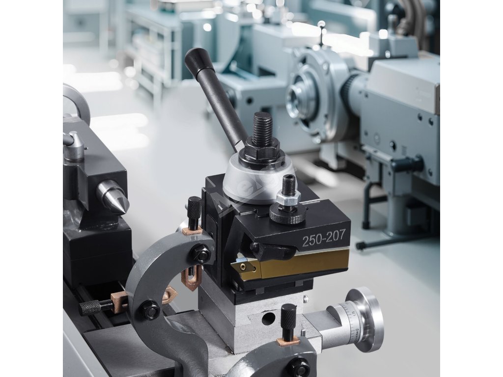 Tento rychlovýměnný držák nástrojů na soustruhu umožňuje bezpečné zajištění nástroje pouhým otočením rukojeti. Zefektivňuje výměnu nástrojů při zachování stability a spolehlivosti.