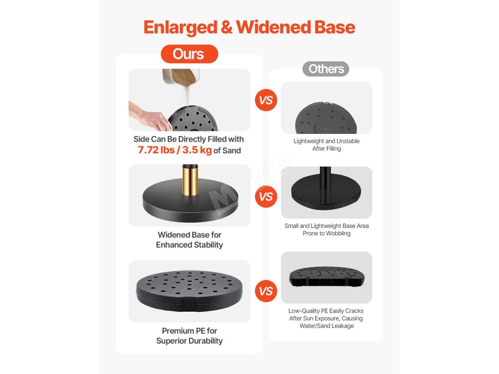 | Hmotnost jedné základny po naplnění pískem | 7.72 liber / 3,5 kg |