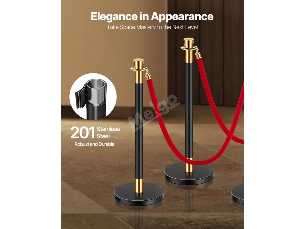 Naše sloupky jsou vyrobeny z pevné nerezové oceli 201 a nabízejí spolehlivost a dlouhou životnost. Díky elegantnímu, minimalistickému designu dodá nádech sofistikovanosti každé události, od červeného koberce po maturitní plesy.