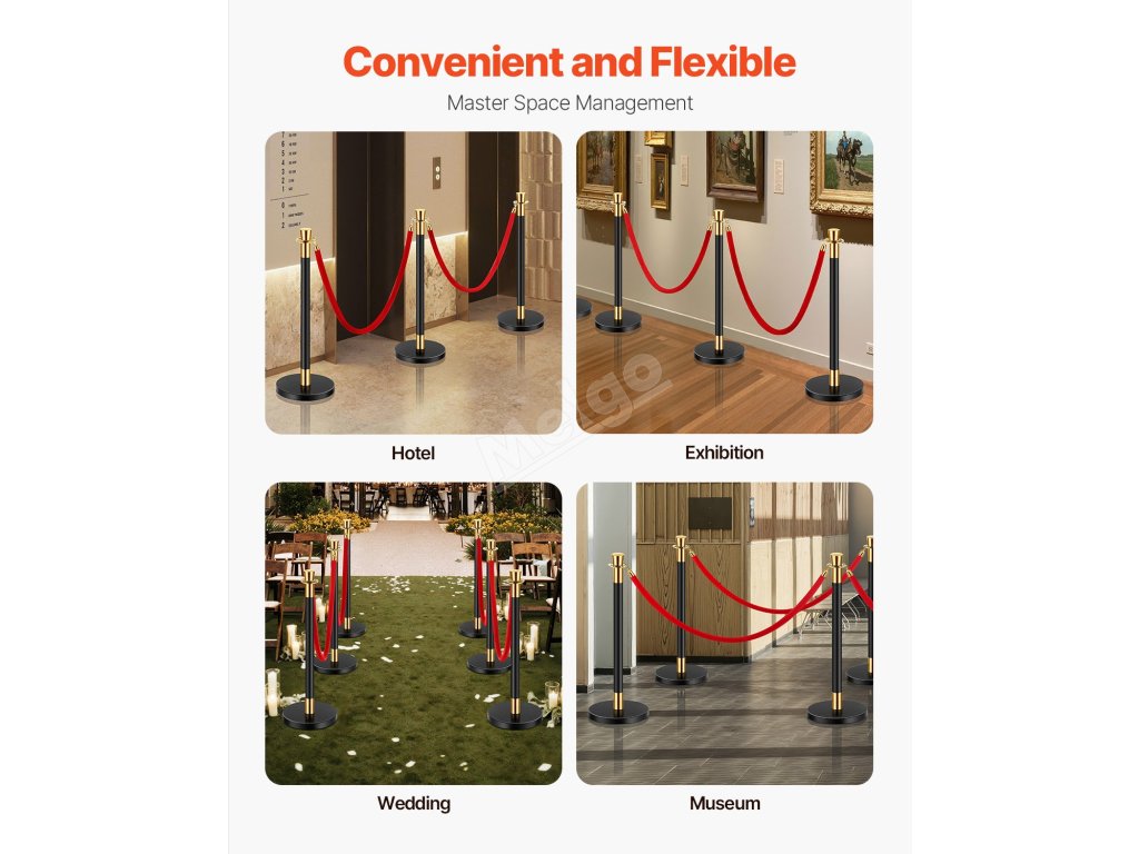 Od hotelů přes výstavy, svatby až po muzea - naše stojany nabízejí profesionální řešení pro kontrolu davu, které se hodí do různých prostředí a zajistí hladký a spořádaný chod davu, ať už ho potřebujete kdekoli.