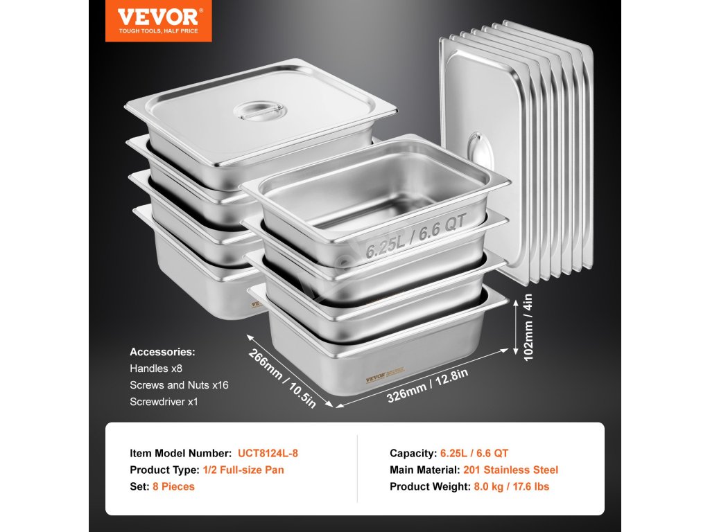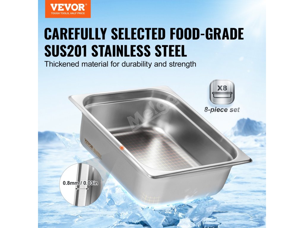 8 balení pánví velikosti 1/2, 4 palce hlubokých. Tyto pánve lze použít k vaření, skladování a vystavování potravin.