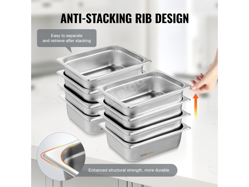 Nerezové hotelové pánve jsou navrženy s drážkami proti stohování, takže je lze při stohování snadno oddělit, a mají zvýšenou konstrukční pevnost pro větší odolnost.
