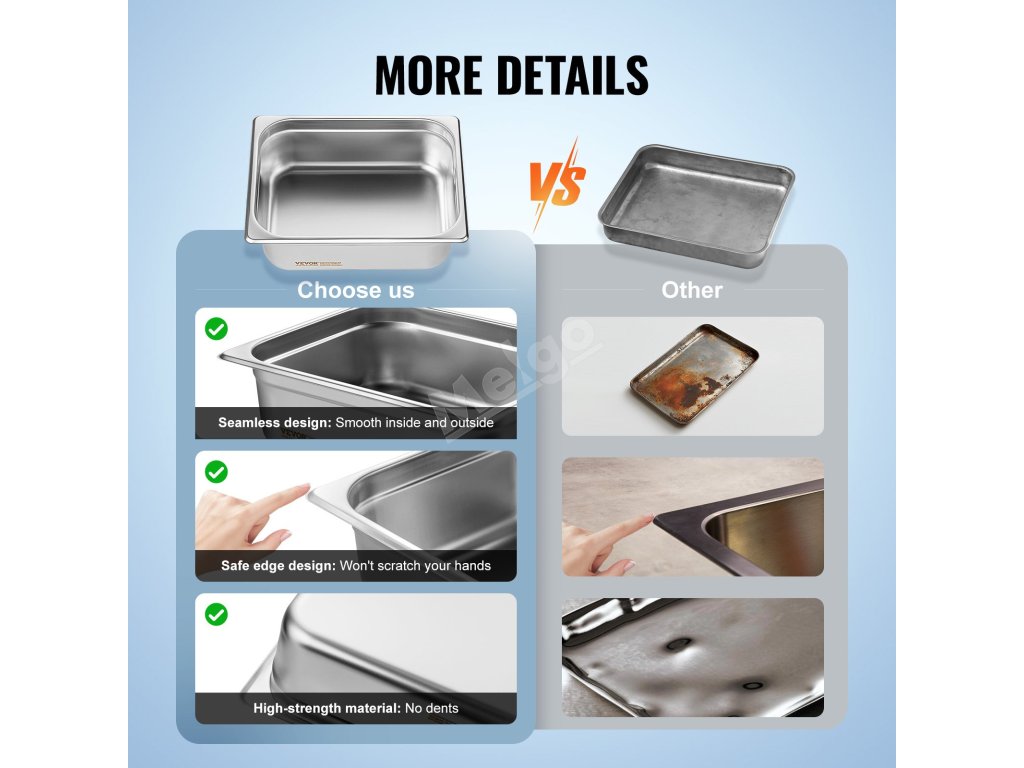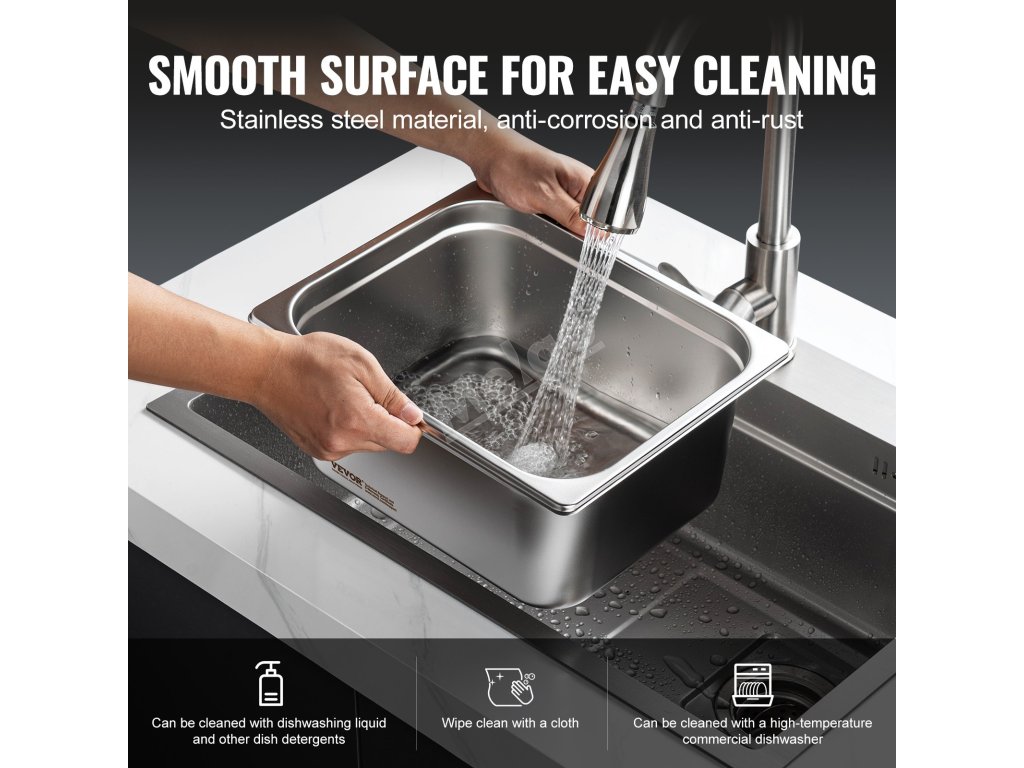 Hotelová pánev je vyrobena z vysoce kvalitní potravinářské nerezové oceli, která odolává vysokým teplotám a mrazu. Jsou vhodné pro trouby, ohřívače parních stolů, chladničky a mrazničky, ideální pro skladování potravin a vaření.