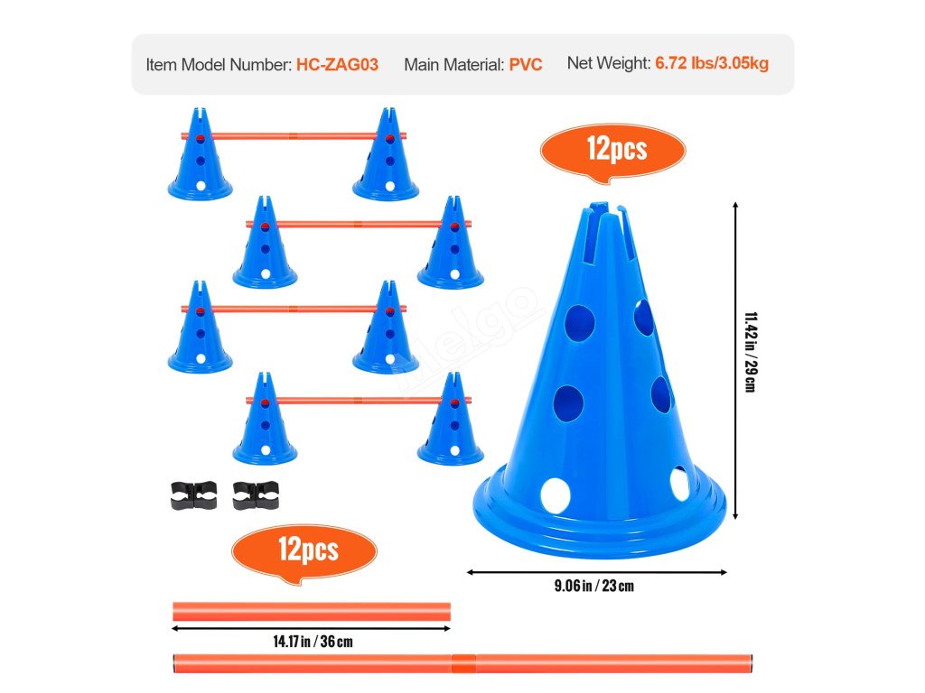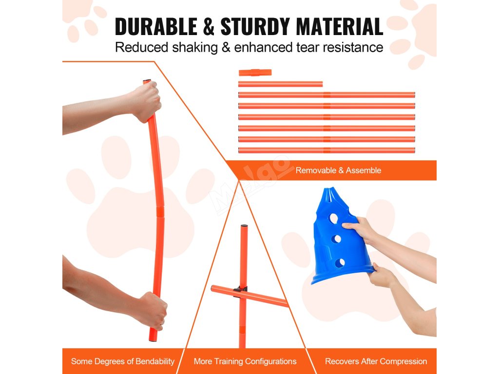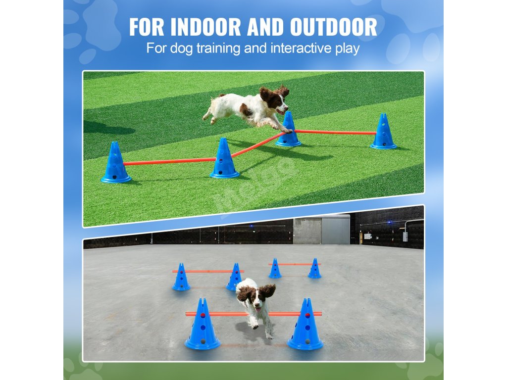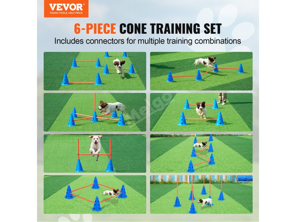 Obsahuje 6 multifunkčních kuželů a skokanských tyčí pro přizpůsobitelné sady, které zlepšují obratnost a poslušnost vašeho psa a zároveň posilují vaše pouto.