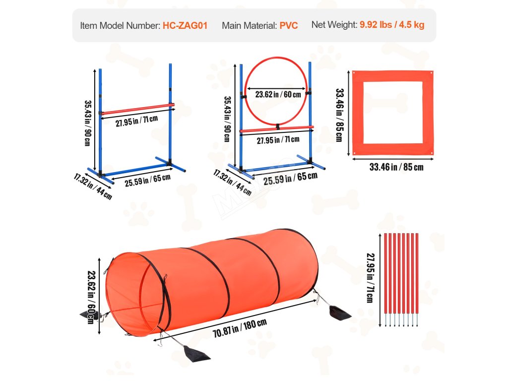 Sada agility pro psy, 5 ks, nastavitelné překážky, 6 tyčí, tunel
