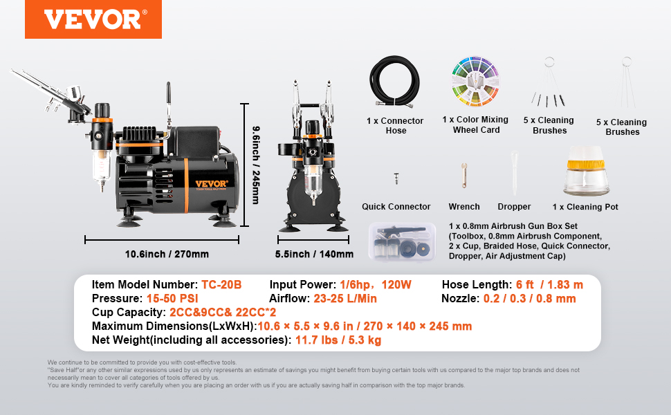 Sada airbrush je vybavena vzduchovým kompresorem o výkonu 1/6 hp a vynikajícím systémem dvou ventilátorů, který zajišťuje průtok vzduchu 23 - 25 l/min (SKU4: 18 - 23 l/min). Stroj zůstává během provozu chladný, což zajišťuje dlouhou pracovní dobu a prodlužuje jeho životnost.