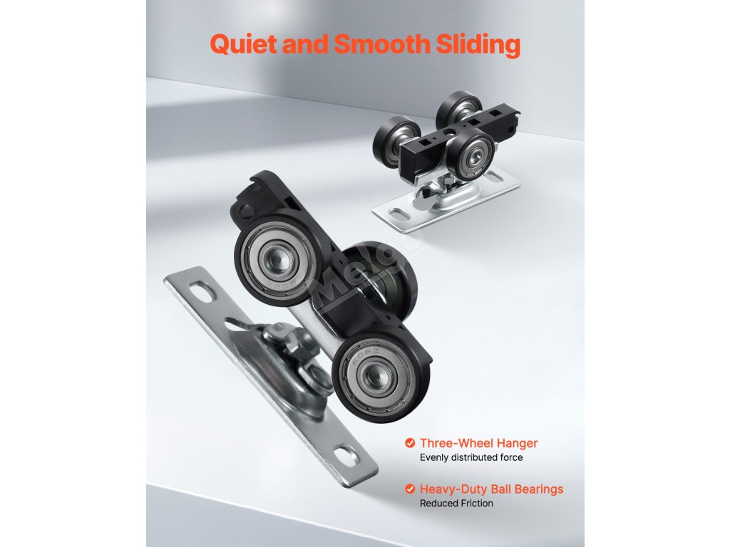 Závěsy této kolejnice pro šatní dveře mají tříkolovou konstrukci s těžkými kuličkovými ložisky, která zajišťují rovnoměrné rozložení hmotnosti. Díky tomu se dveře hladce posouvají, což snižuje hlučnost a zajišťuje stabilní provoz.