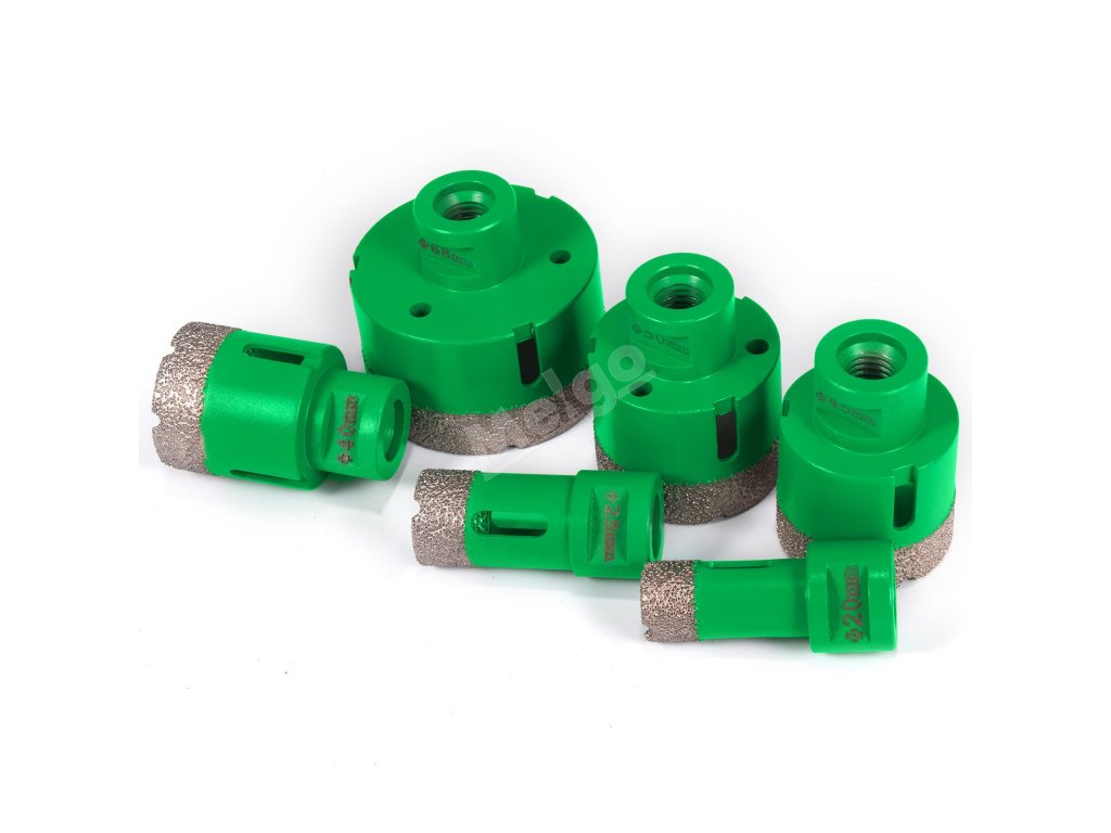 Sada diamantových vrtáků má na hraně malé mezery, které jsou navrženy pro menší tření a hladší a rychlejší řezání.