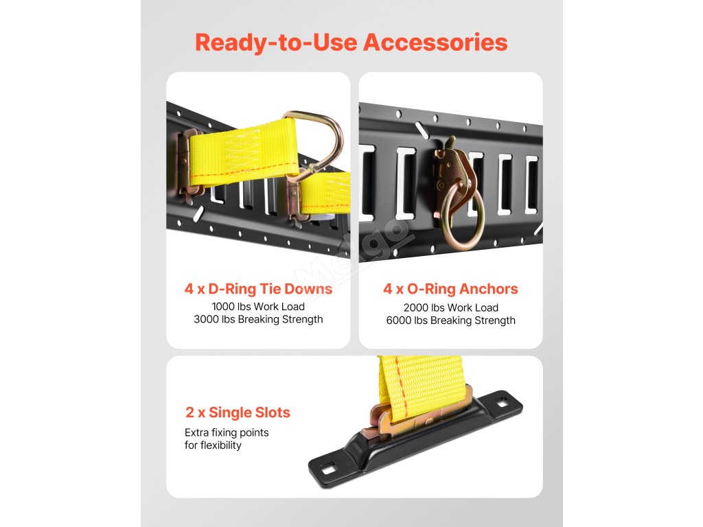 Sada e-track lišt 4×0.4 m, 21 dílů, 2 napínací pásy, 4 d-kroužky