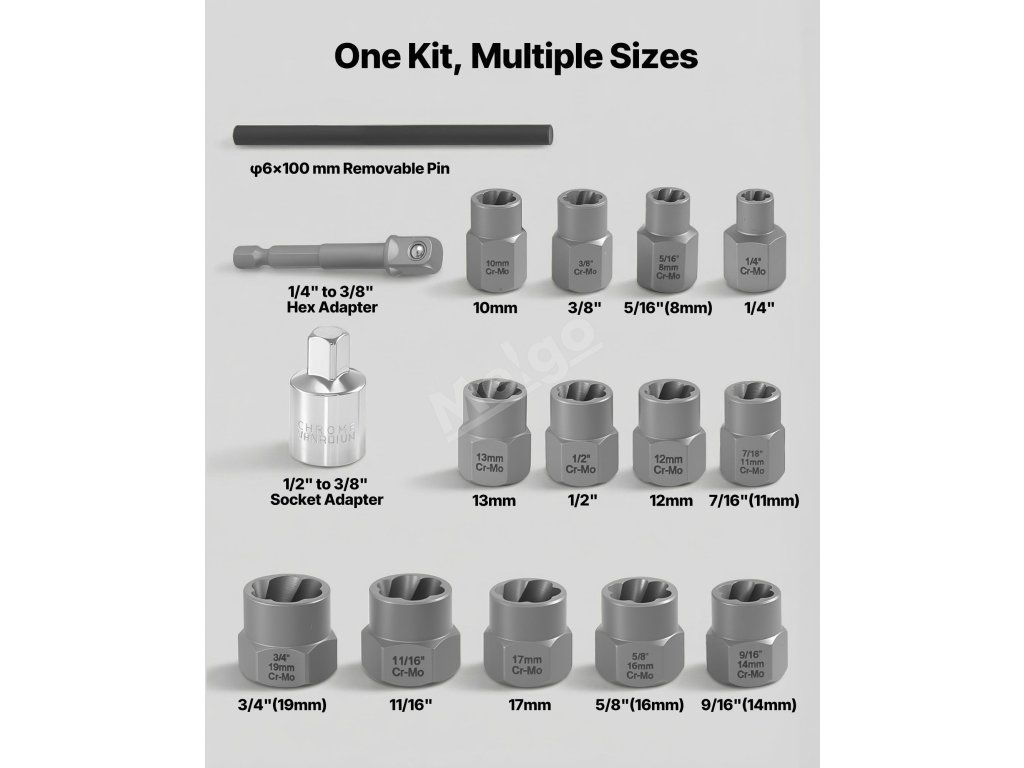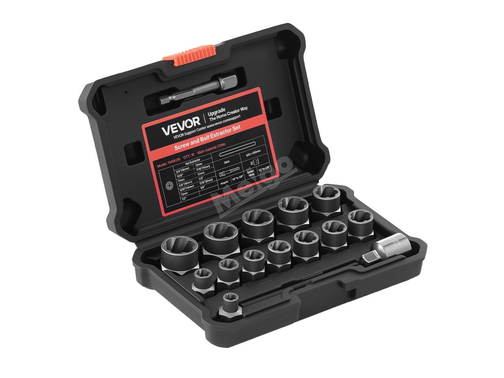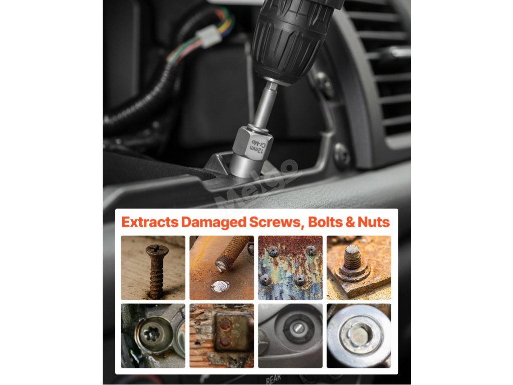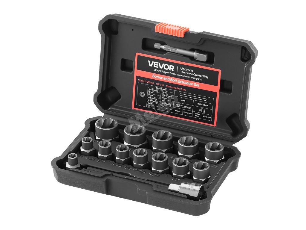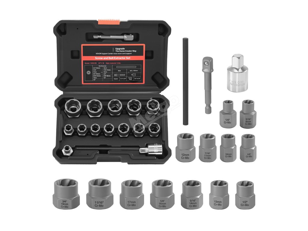 Sada extraktorů šroubů a matic, 16 dílů, cr-mo ocel, adaptéry