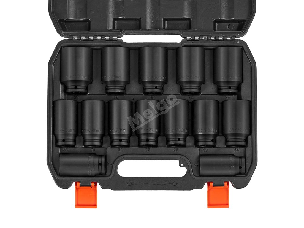 Sada nástrčných hlavic na matice vřeten obsahuje nástrčné hlavice se 6 hroty: 27, 29, 30, 31, 32, 33, 34, 35, 36, 38 mm a 12 hroty: 30, 32, 36, 39 mm, které jsou ideální pro účinné utahování matic a šroubů náprav.