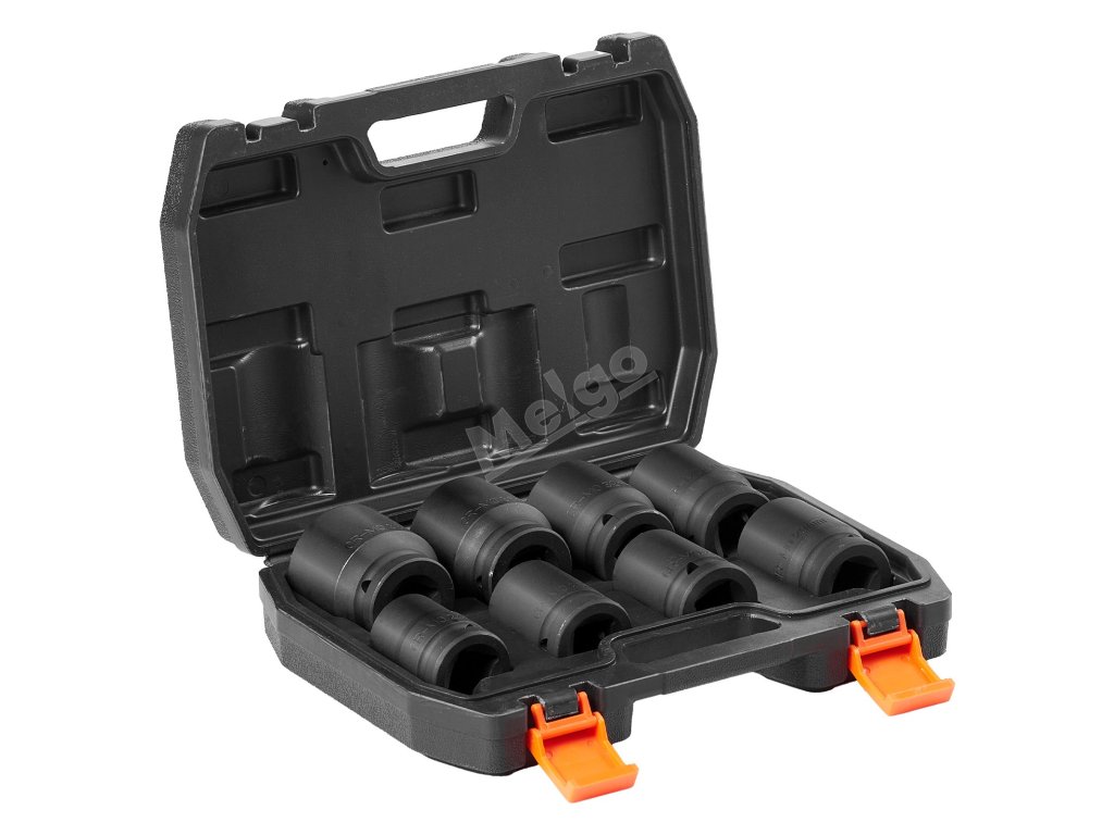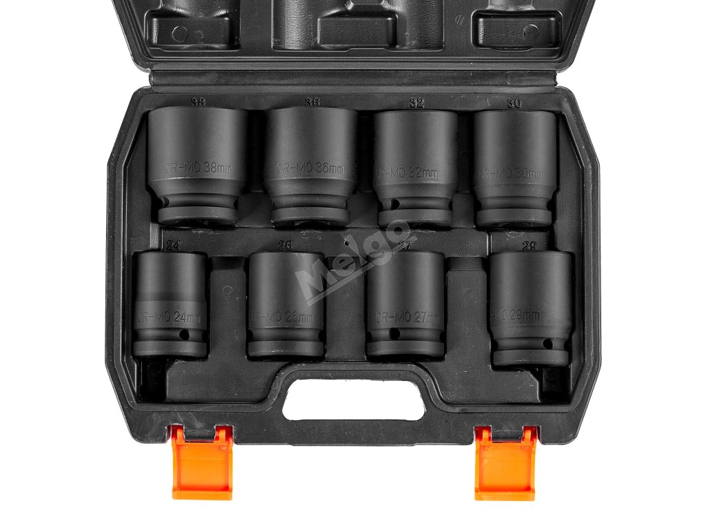 Sada nástrčných hlavic na matice vřeten obsahuje hlavice o velikostech 24 mm, 26 mm, 27 mm, 29 mm, 30 mm, 32 mm, 36 mm a 38 mm, které jsou ideální pro účinné utahování matic a šroubů náprav.
