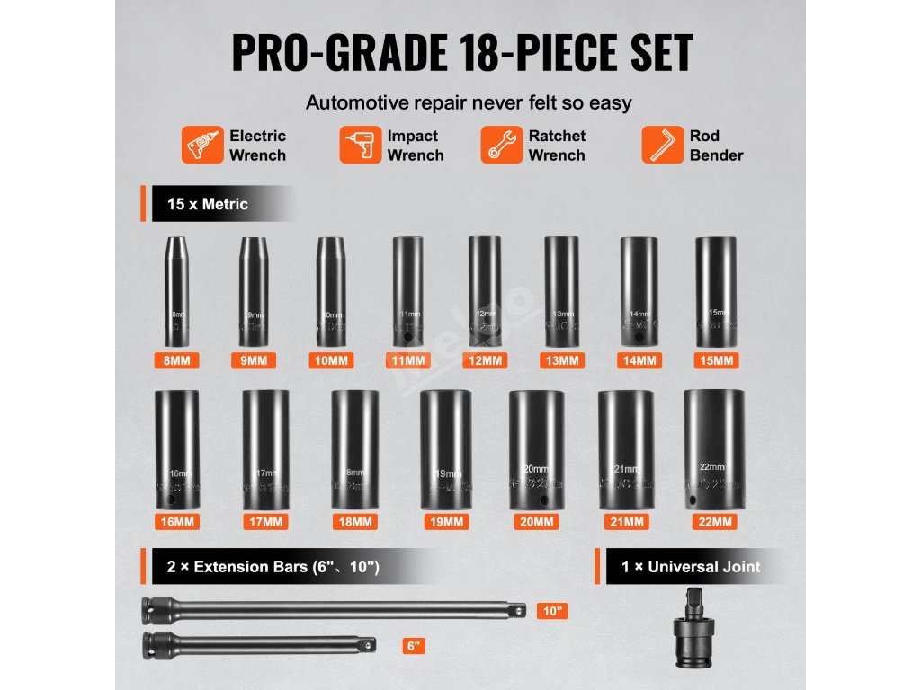 Tuto sadu s profesionální konfigurací 18 dílů lze použít s elektrickým klíčem, rázovým utahovákem, ráčnovým klíčem, ohýbačkou tyčí a dalším nářadím pro údržbu automobilů, montáž zařízení, průmyslovou výrobu, kontrolu výkonu a další.