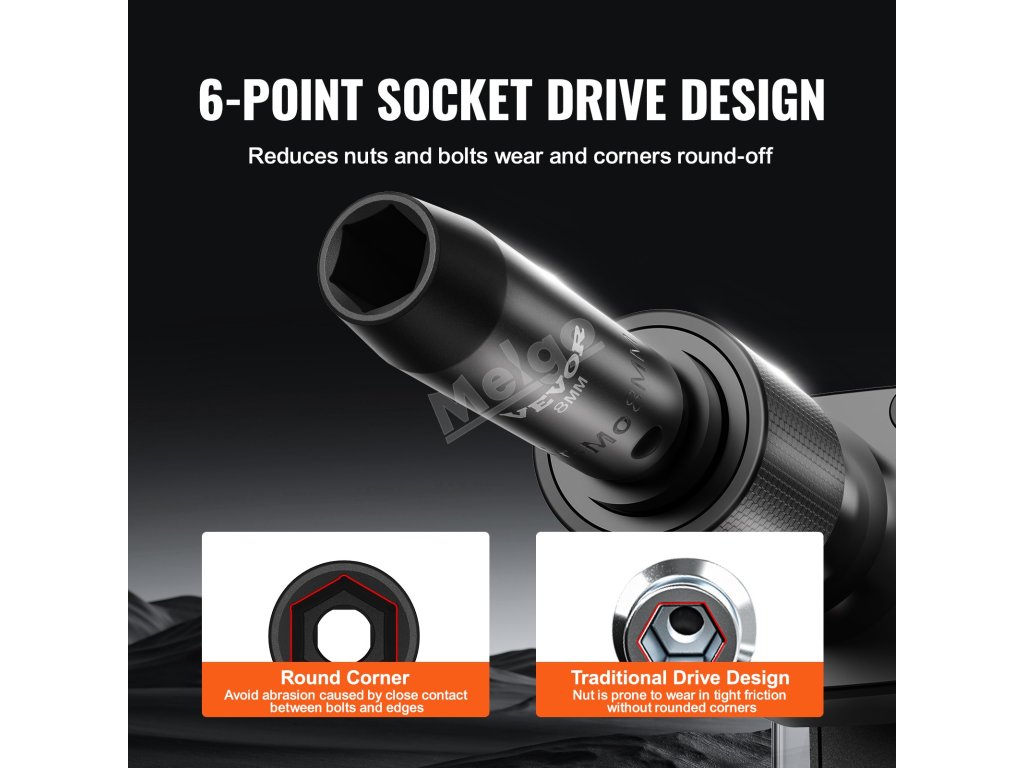 Šestihranná konstrukce nástrčné hlavice vytváří při práci mezeru mezi maticí a okraji, což zabraňuje nadměrnému tření a opotřebení. Odolává větší nárazové síle a účinně odstraňuje šrouby.