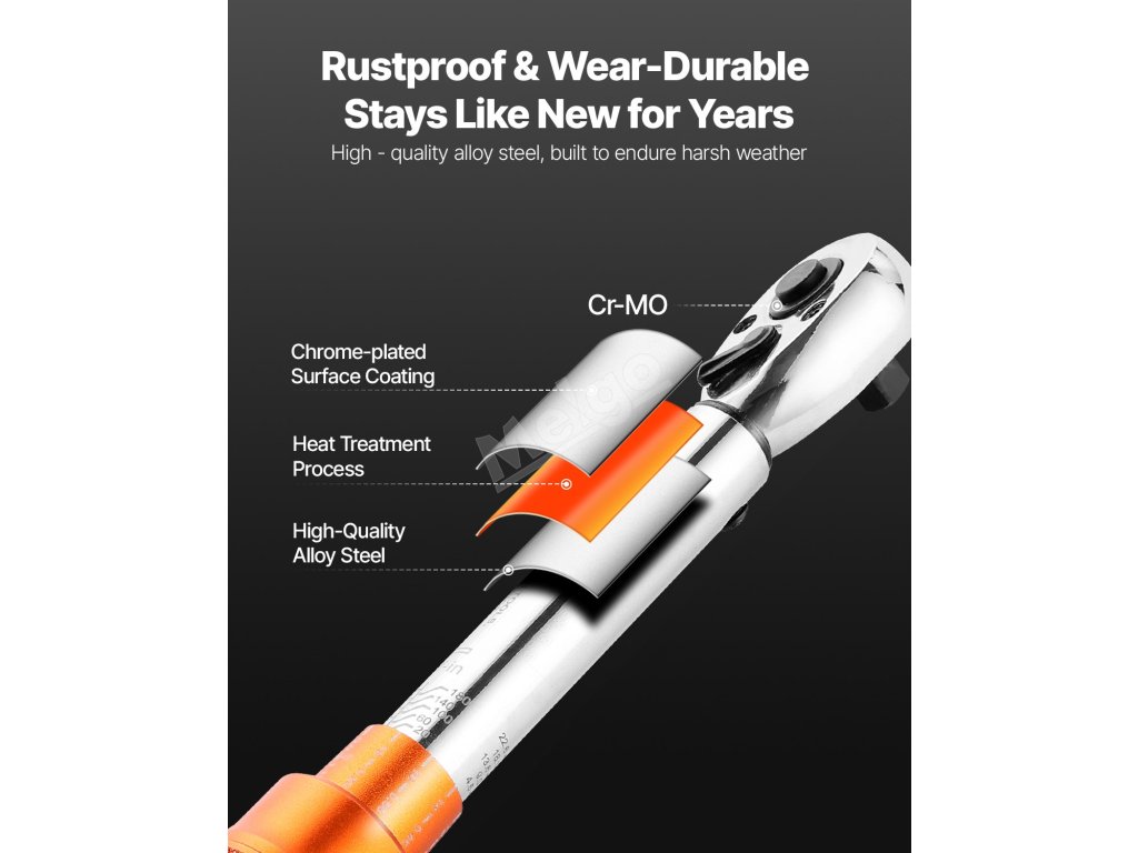Tento momentový klíč je vyroben z vysoce kvalitní legované oceli a tepelně zpracován s chromovanou povrchovou úpravou a poskytuje výjimečnou pevnost, přesnost a odolnost, takže je ideální volbou pro profesionální upevňovací úkoly.