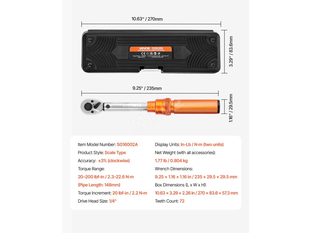 Sada klikového momentového klíče 1/4Inch, 20-200lbf-in/2.3-22.6N.m ±3%