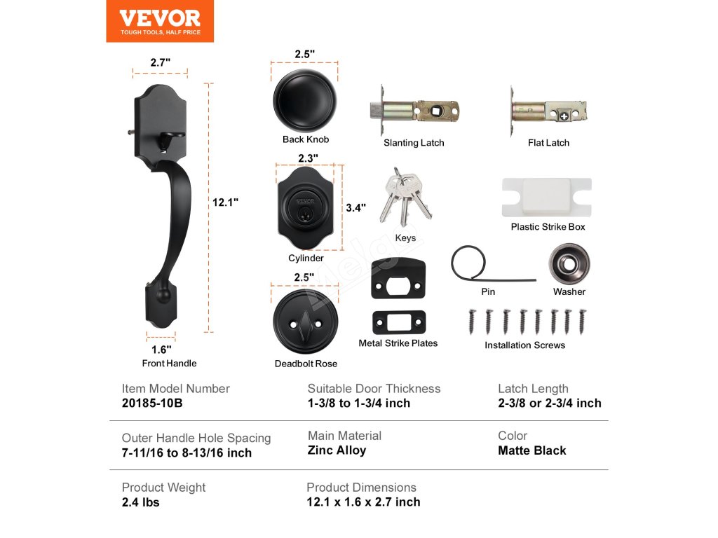Tato sada zámku na přední dveře se závorou má rozměry 11,2'' D x 3,9'' Š x 6,1'' V s roztečí vnějších otvorů pro kliku od 7-11/16 do 8-13/16 palců (195-224 mm). Umožňuje snadno doladit polohu zámku dveří v určitém rozsahu, a to vše bez nutnosti vrtání.