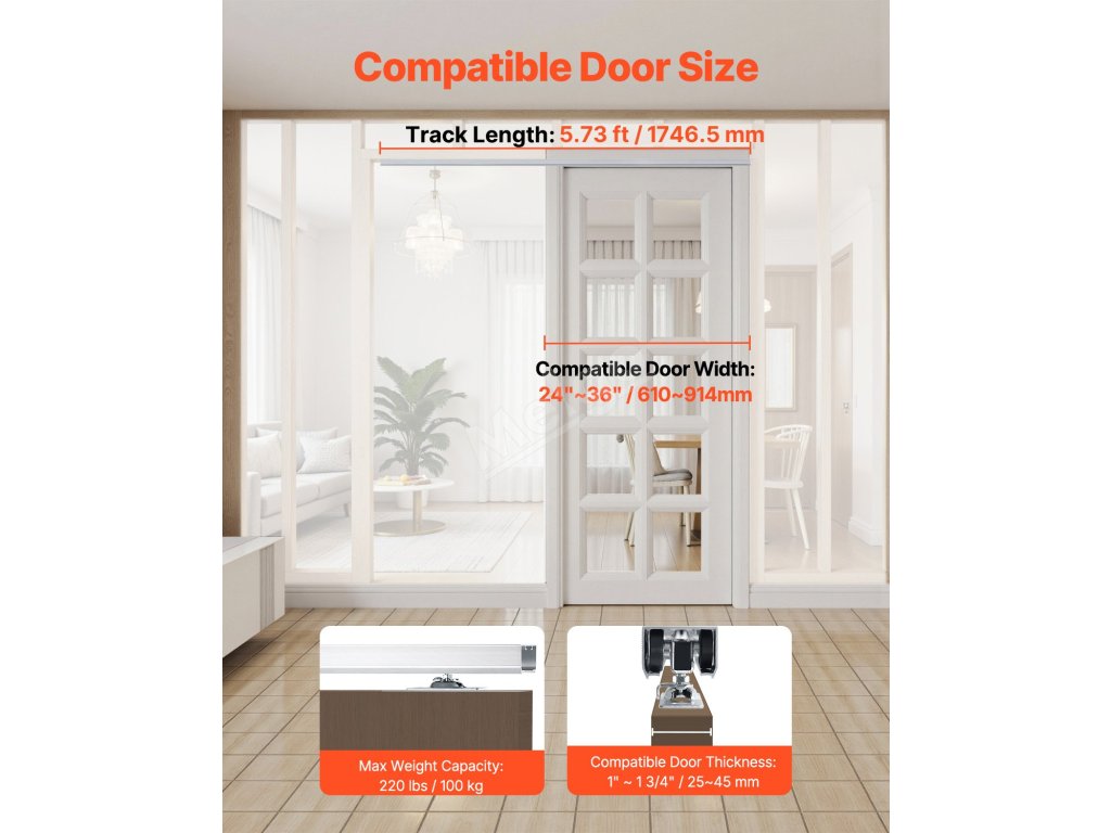 Tato sada kování pro 6 stop dlouhé dveře je vhodná pro dveře o tloušťce 1" až 1 3/4" a šířce 24" až 36" s maximální nosností 220 liber. Můžete si vybrat velikost, která vyhovuje vašim potřebám.