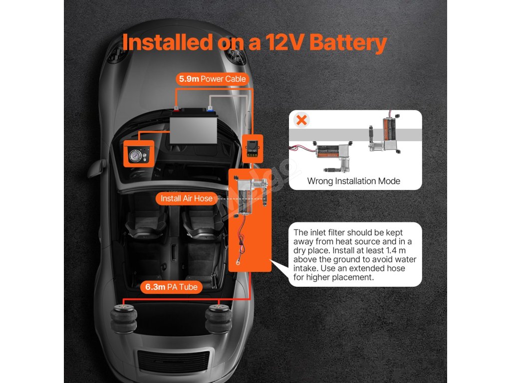 Sada kompresoru vzduchového odpružení se dodává s univerzálními konektory, takže je kompatibilní s většinou kompresorových systémů vzduchového odpružení. Při instalaci dbejte na to, aby byly hadice a kabely v optimální bezpečnostní vzdálenosti alespoň 6 cm od jakéhokoli zdroje tepla, například výfukového potrubí.