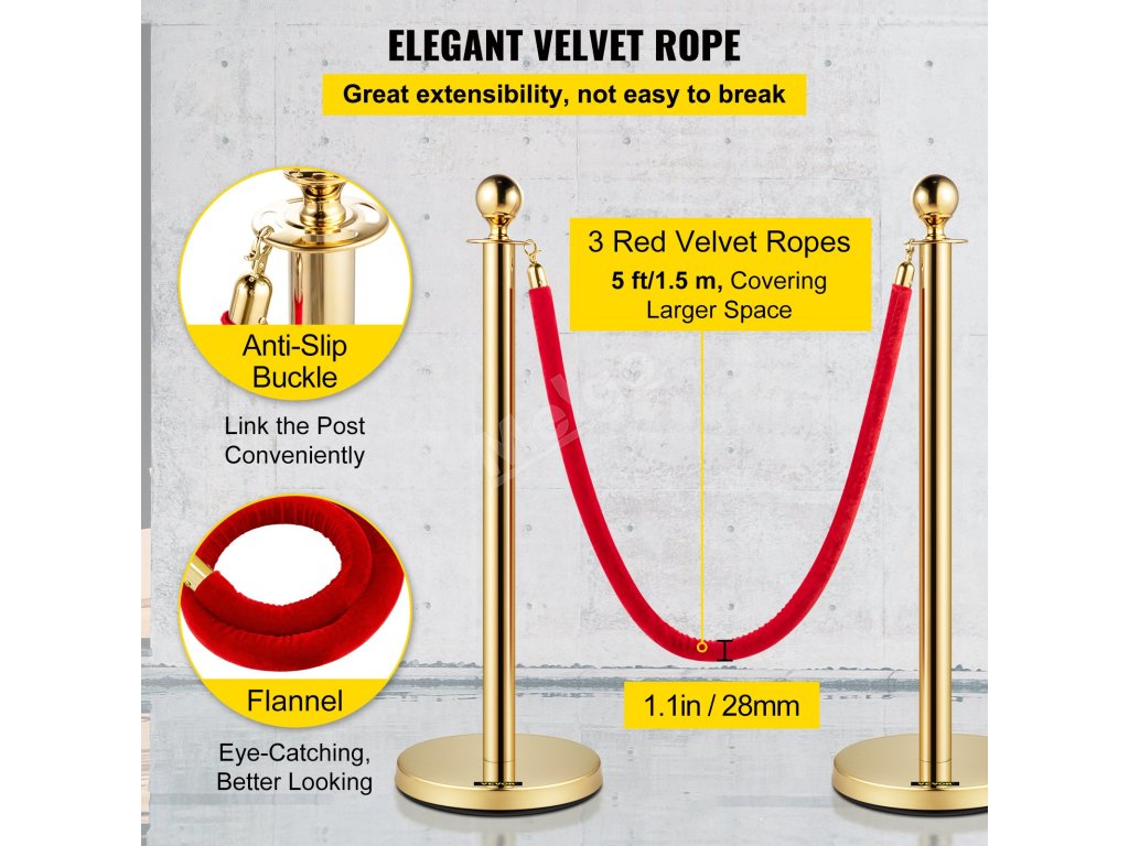Sada kordonů s červeným 1,5 m lanem, zlaté nerez sloupky 6 ks