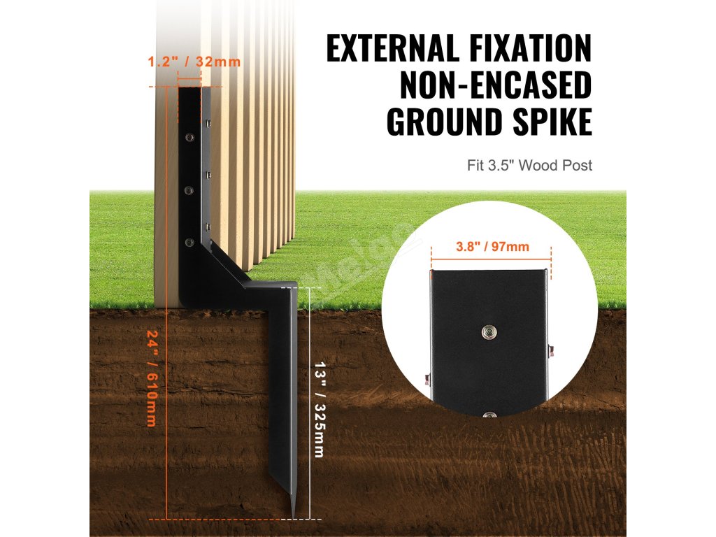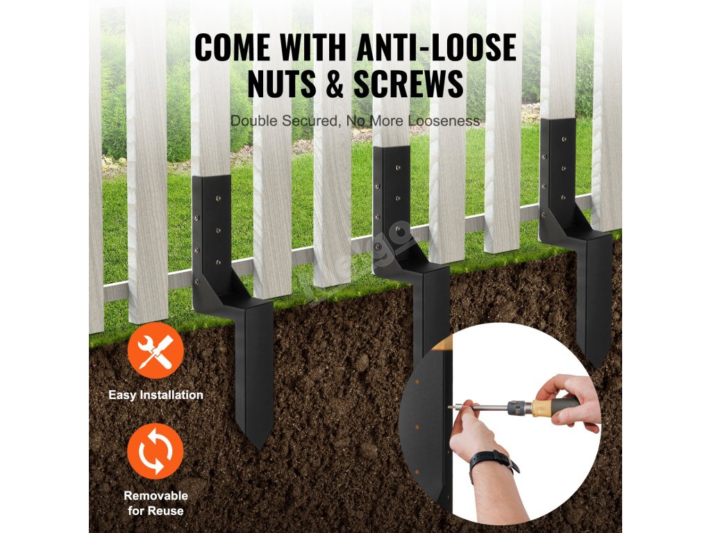 Instalace je jednoduchá - není potřeba žádný výkop ani cement. Umístěte hrot, přidejte dřevěný blok a zatlučte kladivem. Po několika úderech zkontrolujte, zda je hrot v rovině, zatlačte jej zcela do země a vyměňte jej za plotový sloupek.