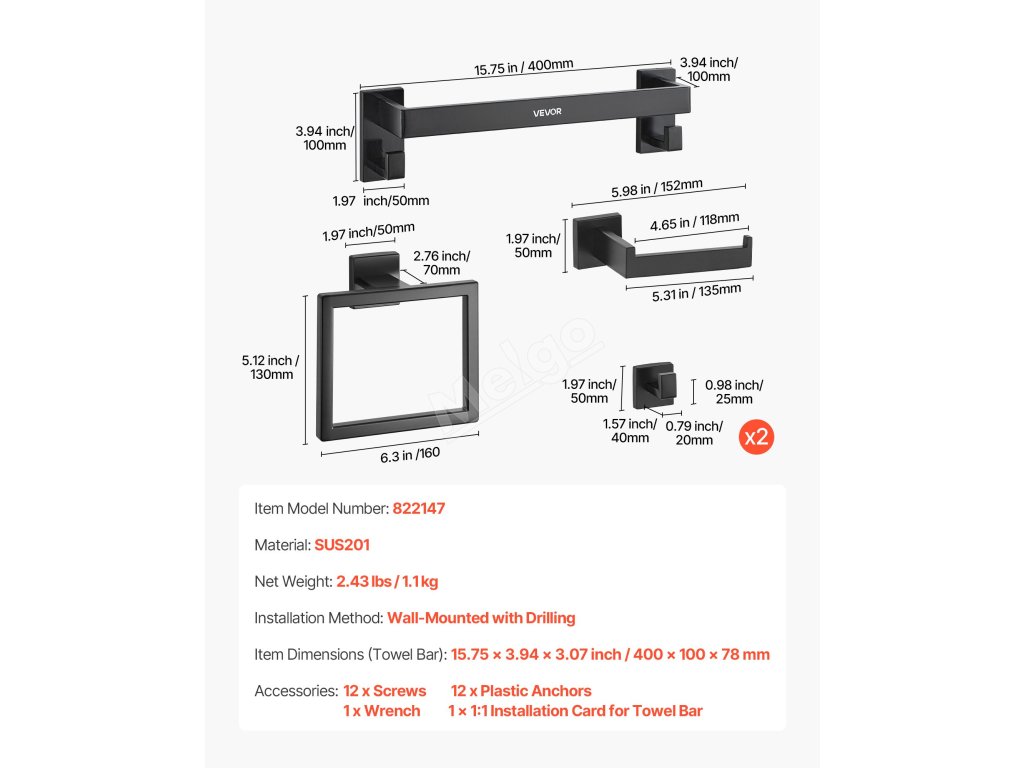 | Rozměry držáku ručníků | 15.75 x 3,94 x 3,07 palce / 400 x 100 x 78 mm |