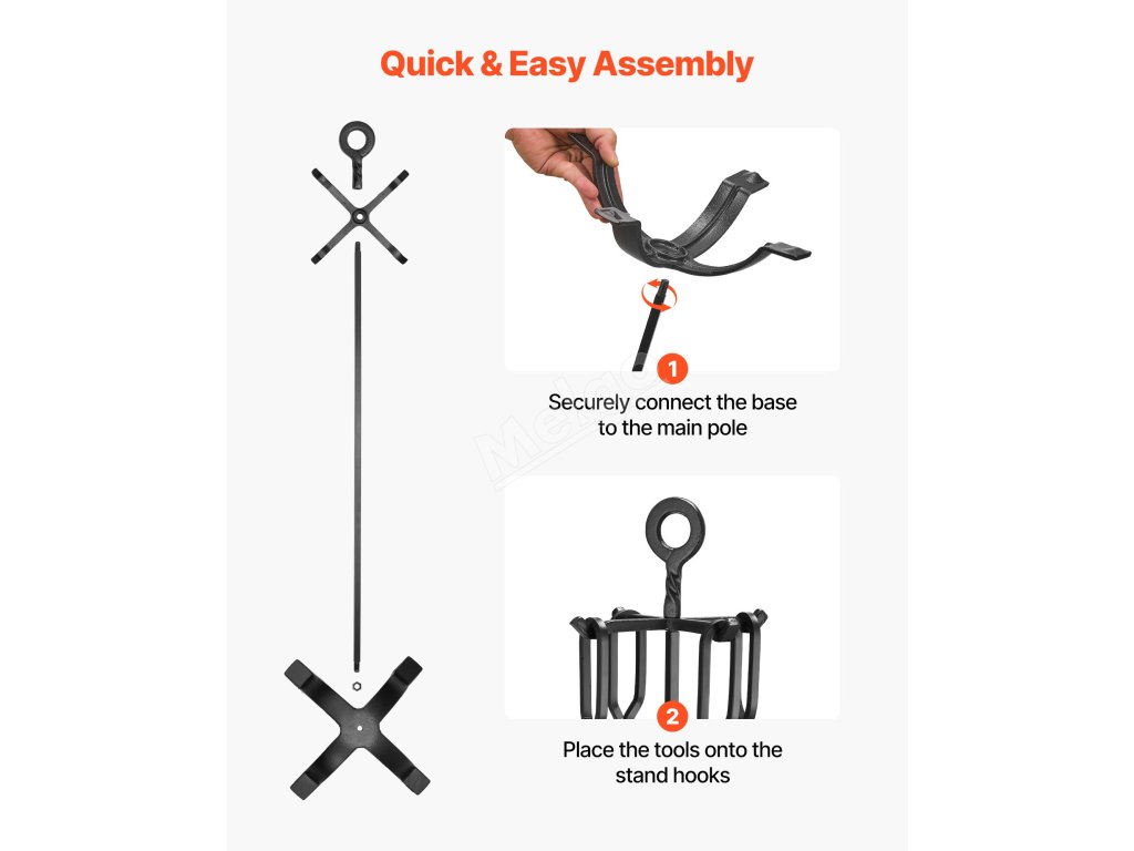 Díky pevnému a kvalitnímu stojanu, stabilním hákům a odolné základně udrží toto krbové nářadí každý kus bezpečně na svém místě. Robustní konstrukce zajišťuje, že nářadí zůstane přehledně uspořádané a snadno přístupné.