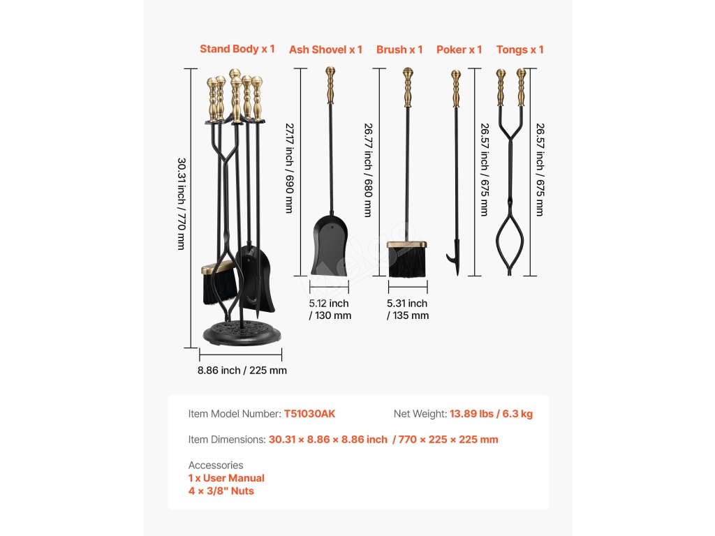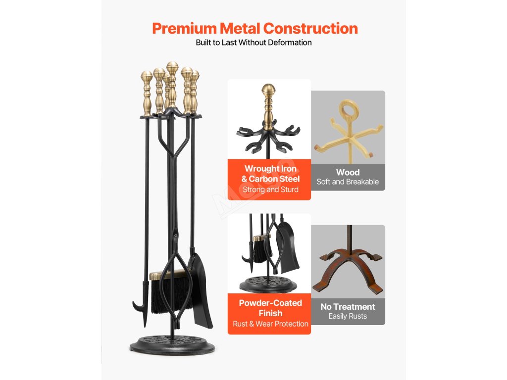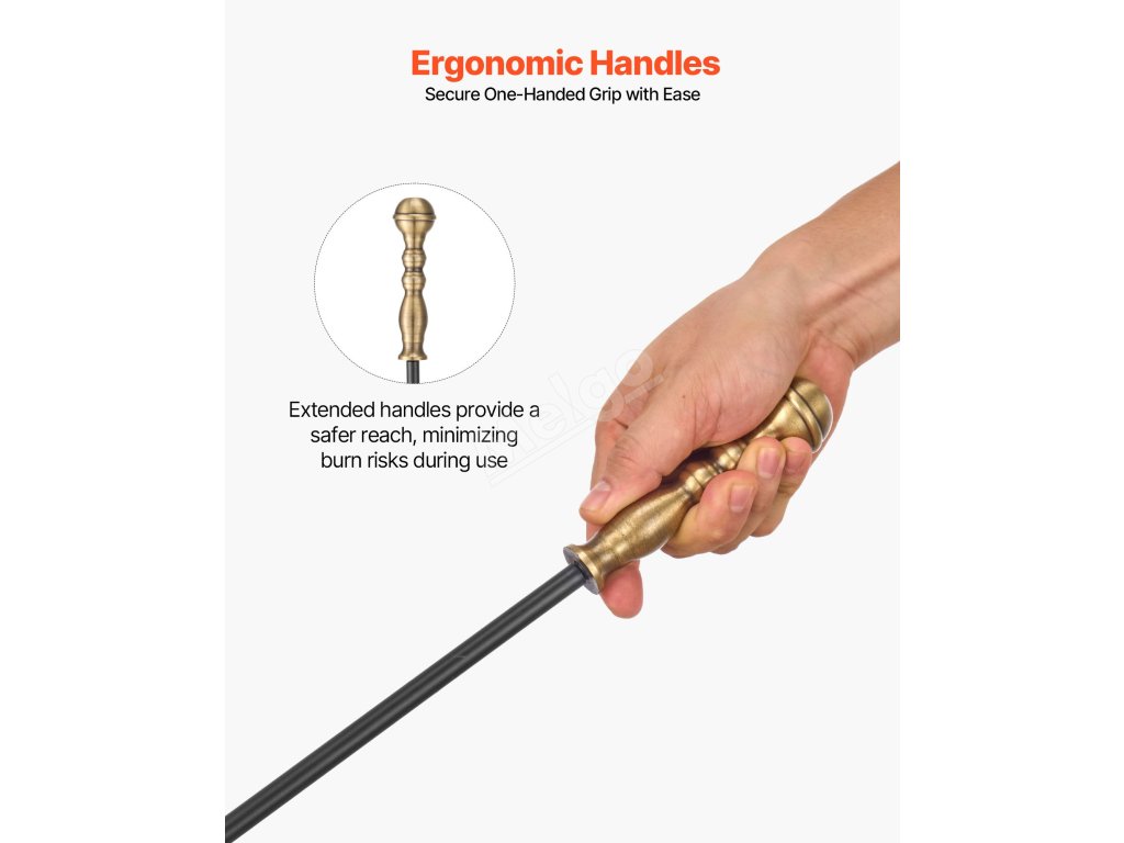 Tato sada krbového nářadí je vyrobena z prvotřídního tepaného železa, uhlíkové oceli a práškového laku a je odolná proti ohybu, korozi a vysokým teplotám, což zajišťuje dlouhou životnost. Ergonomické prodloužené rukojeti poskytují pohodlné uchopení odolné vůči vysokým teplotám, které je nezbytnou pomůckou při používání krbu.