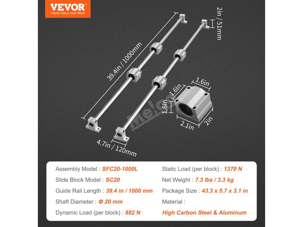 Lineární vodicí lišta VEVOR SFC obsahuje 2 vodicí lišty a 4 posuvné bloky. Odolné hliníkové vodicí lišty mají přesný průměr a rozteč otvorů, zatímco posuvné bloky SC používají kuličková ložiska pro plynulý a nerušený pohyb. K dispozici je více specifikací, které dokonale vyhovují vašim potřebám.
