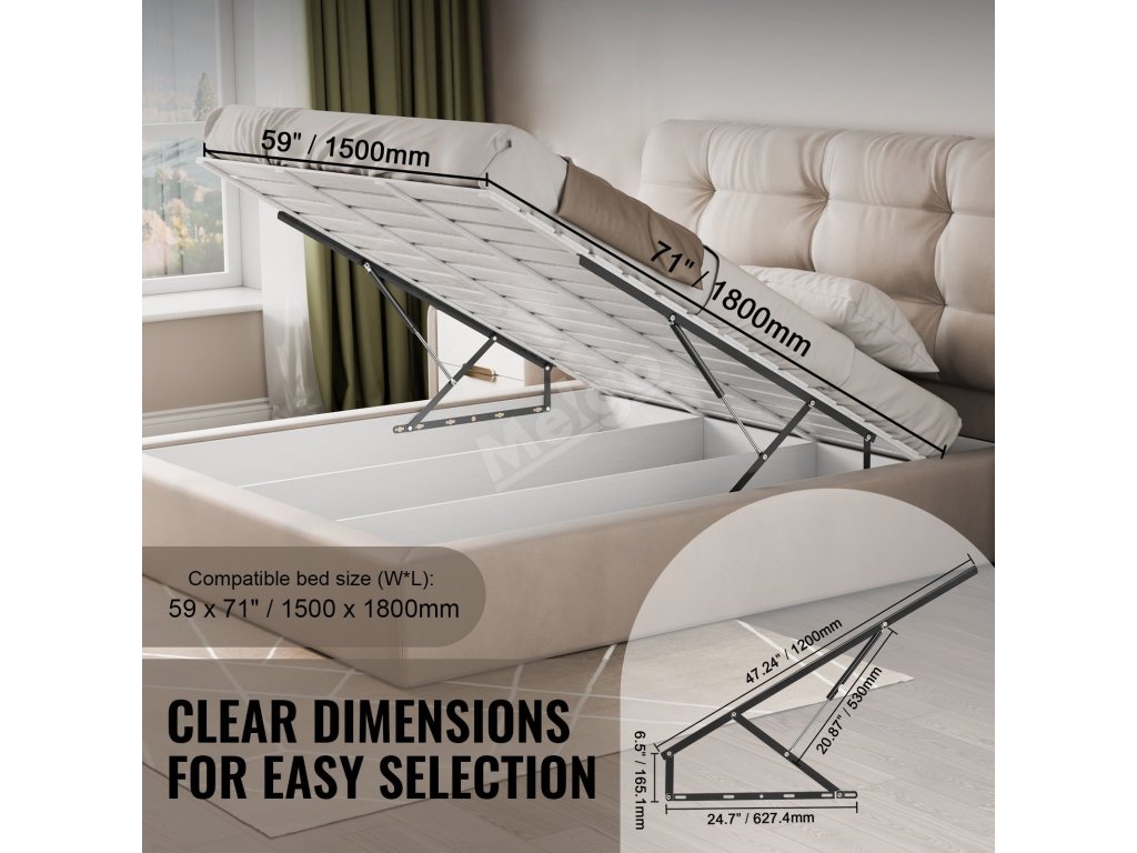 Tato hydraulická sada pro zvedání postelí je vhodná pro rozkládací pohovky nebo postele o rozměrech 59 × 71". Mechanismus lze orientovat tak, aby se otevíral z boku nebo z konce postele.