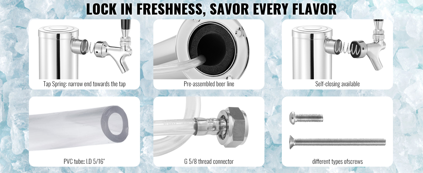 Věžová sada kegerátoru VEVOR s konektorem na sudy S-system se používá k podávání různých nápojů a je vybavena 8mm vnitřní izolační pěnou, která minimalizuje vliv vnějších teplot a zajišťuje, že nápoje, jako je pivo, kombucha a sodová voda, zůstávají v ideální teplotě pro dokonalou chuť.