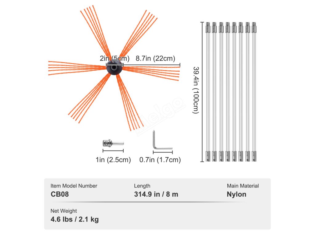 Sada na čištění komína 8 m, 8 zesílených nylonových tyčí, kartáč 360°