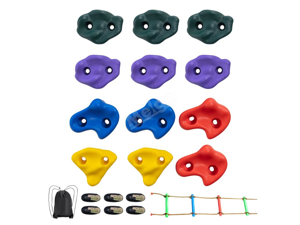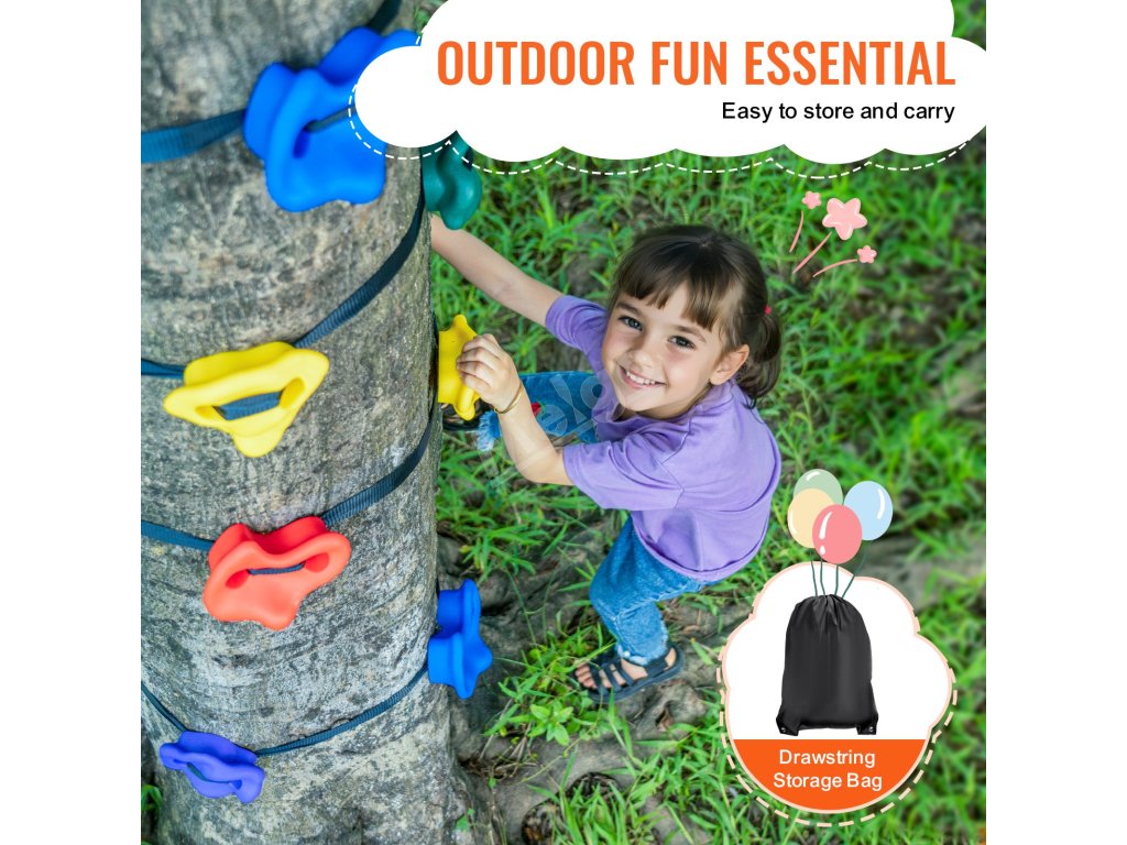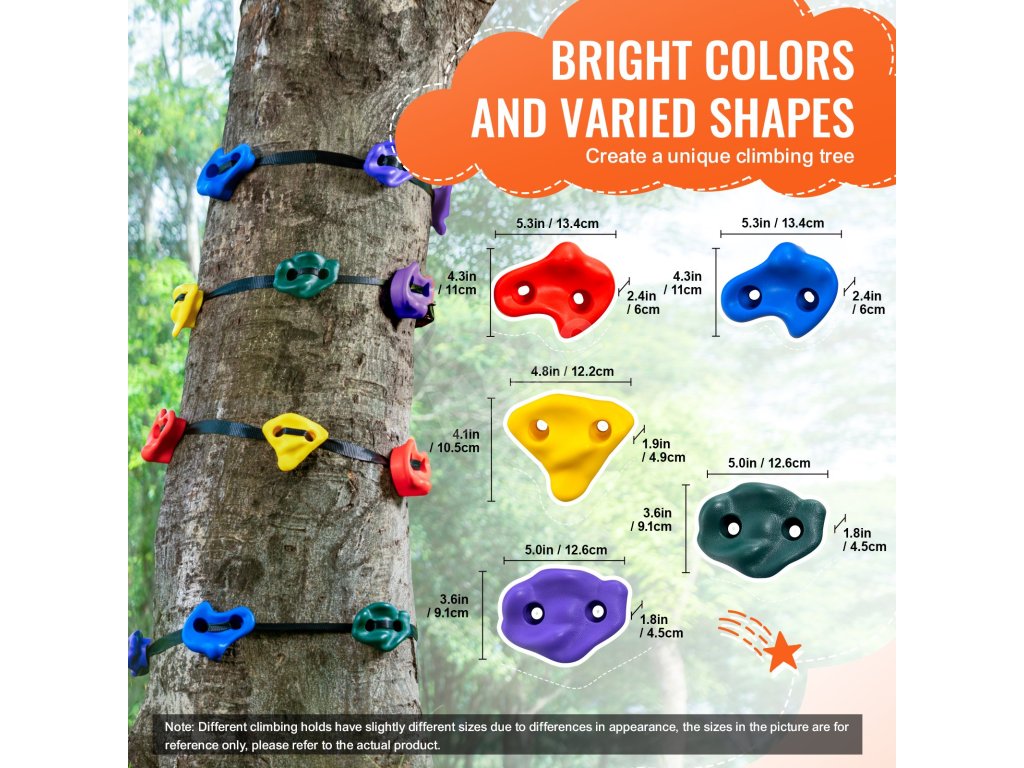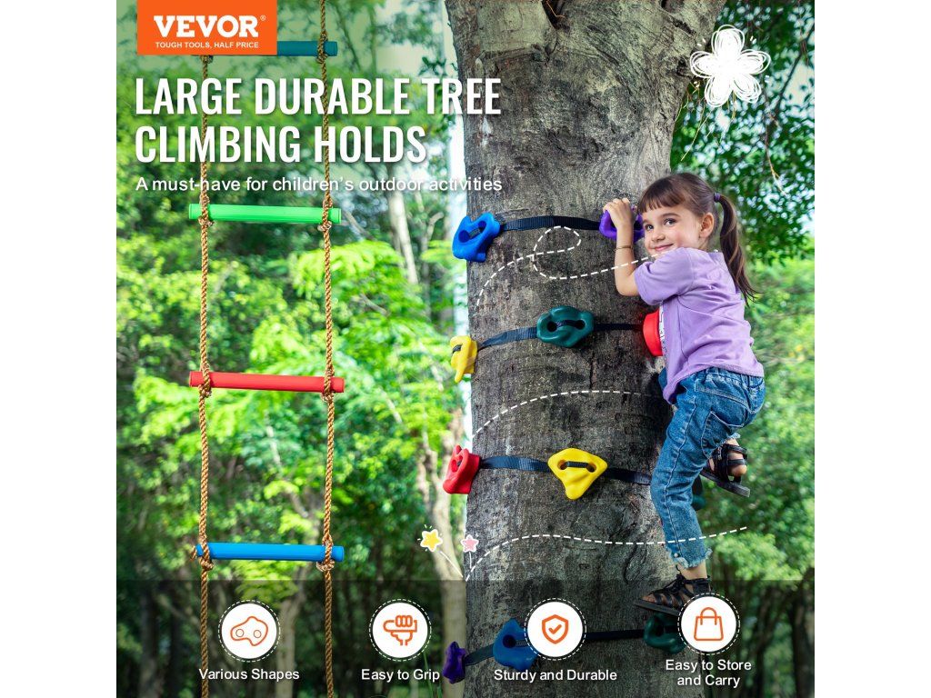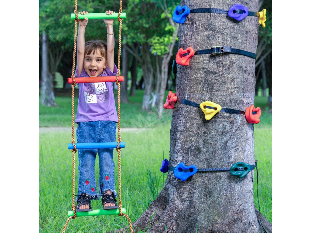Tyto lezecké chyty lze snadno připevnit ke stromům, takže děti mohou lézt stejně jako na skalní stěně. Jsou ideálním doplňkem k domku na stromě na zahradě nebo k tréninkovému vybavení ninja bojovníků, které jim dodá dobrodružství a podpoří lásku k venkovním aktivitám.