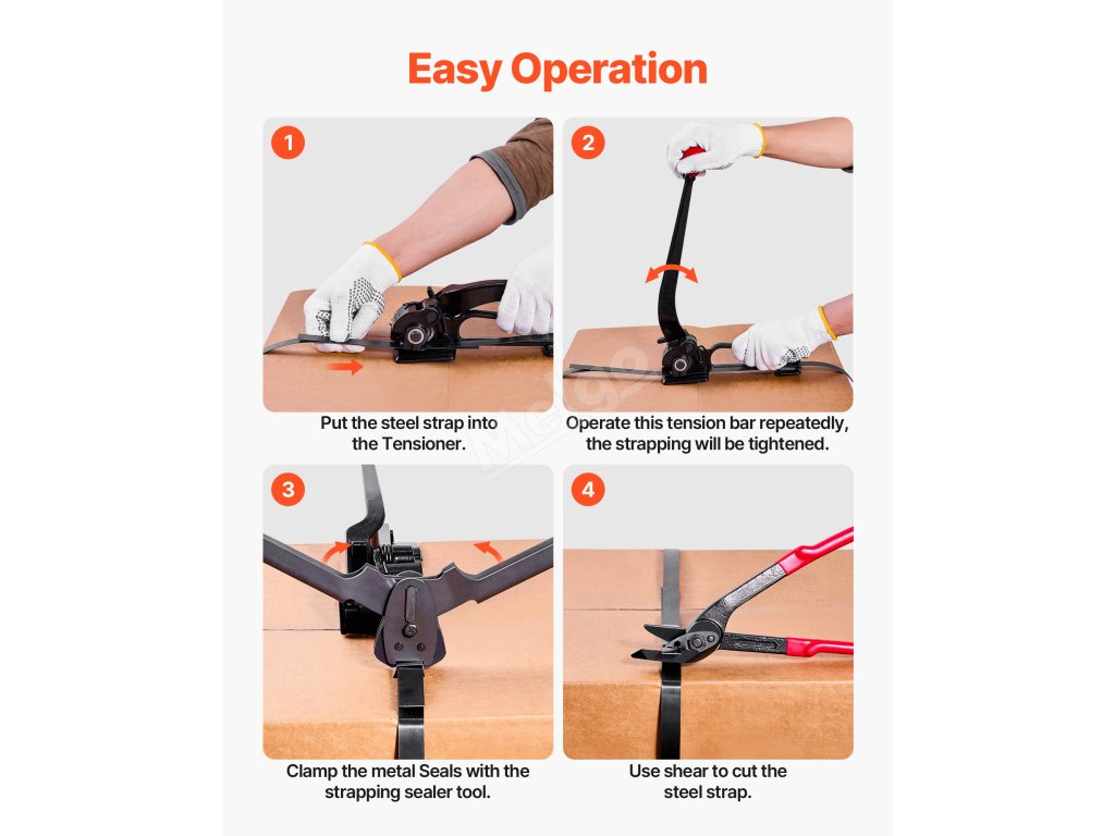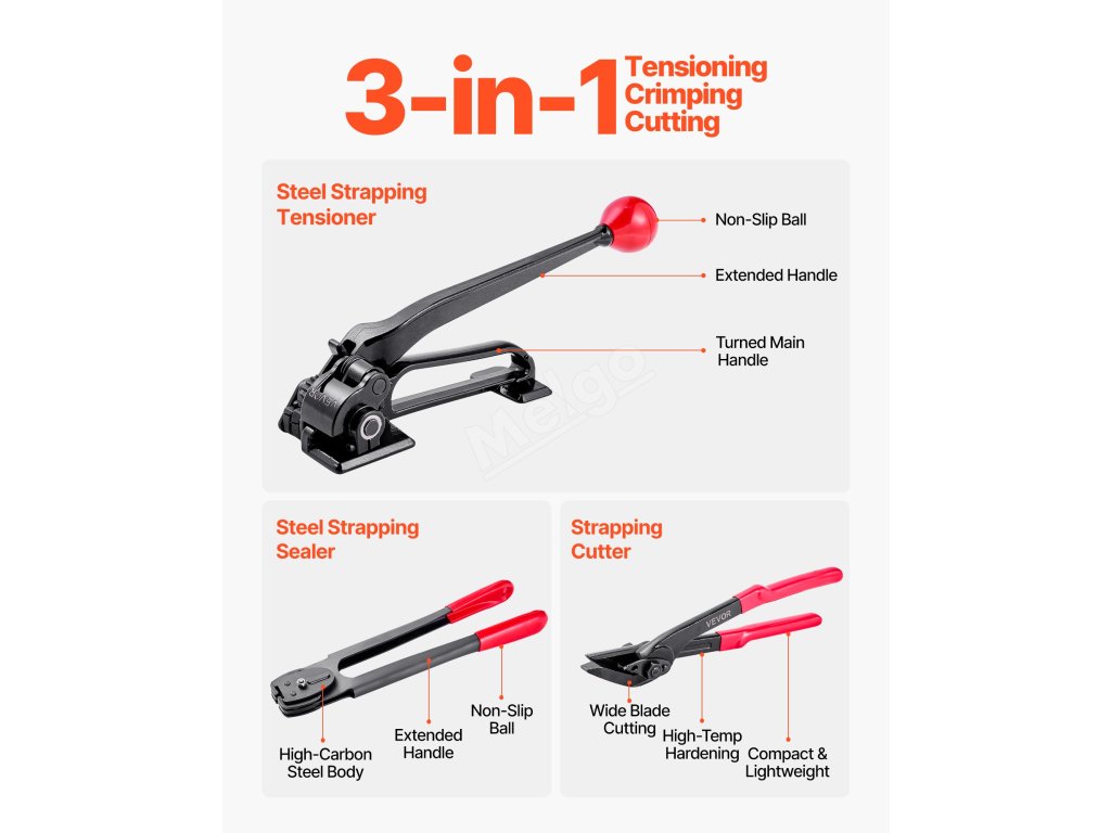 Napínák má válečkovou konstrukci, která neklouže a pohodlně se drží. Napínák má dlouhou rukojeť, která šetří námahu a usnadňuje ovládání. Řezačka nabízí široký řezný účinek nože. Tyto 3 nástroje pracují synergicky a pokrývají celý proces páskování ocelovou páskou od napínání až po utěsňování a řezání.