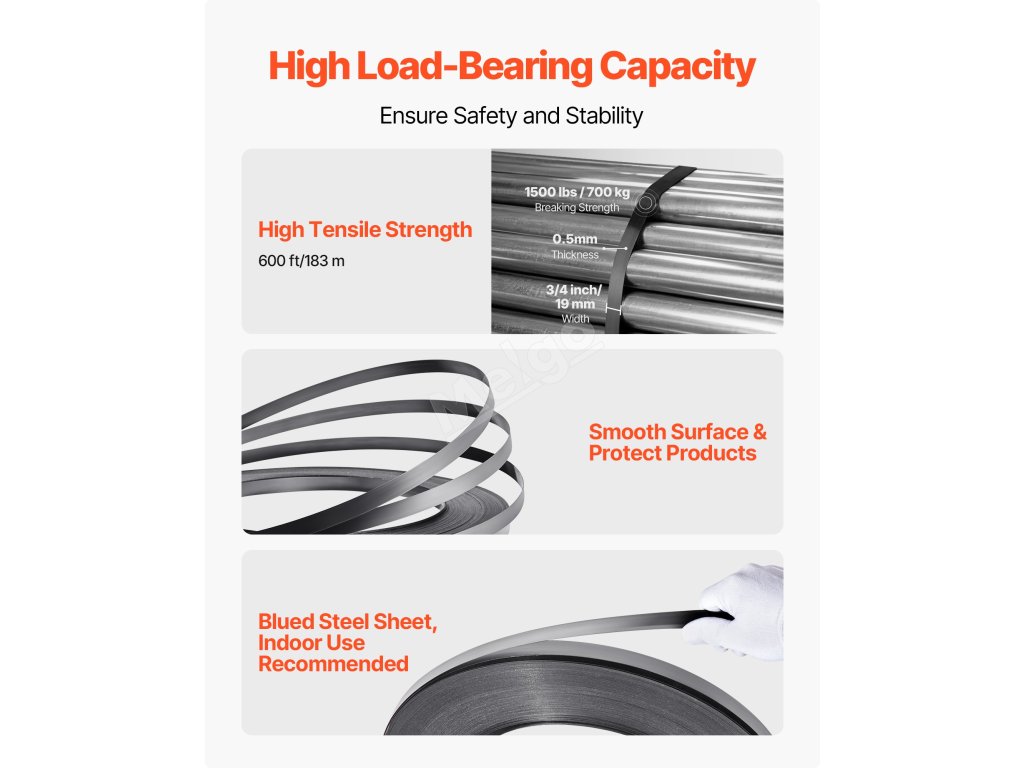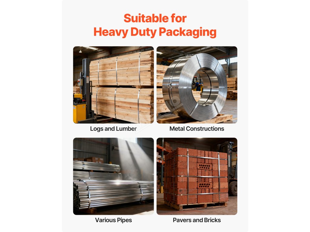 Sada na vázání palet je odolná proti korozi a rzi, má vysokou tvrdost a je nehořlavá. Ať už je určena k vázání těžkých strojů nebo k zajištění stavebních materiálů ve venkovním prostředí, zachovává si stabilní výkon i v náročných podmínkách, jako je vlhkost a vysoké teploty.