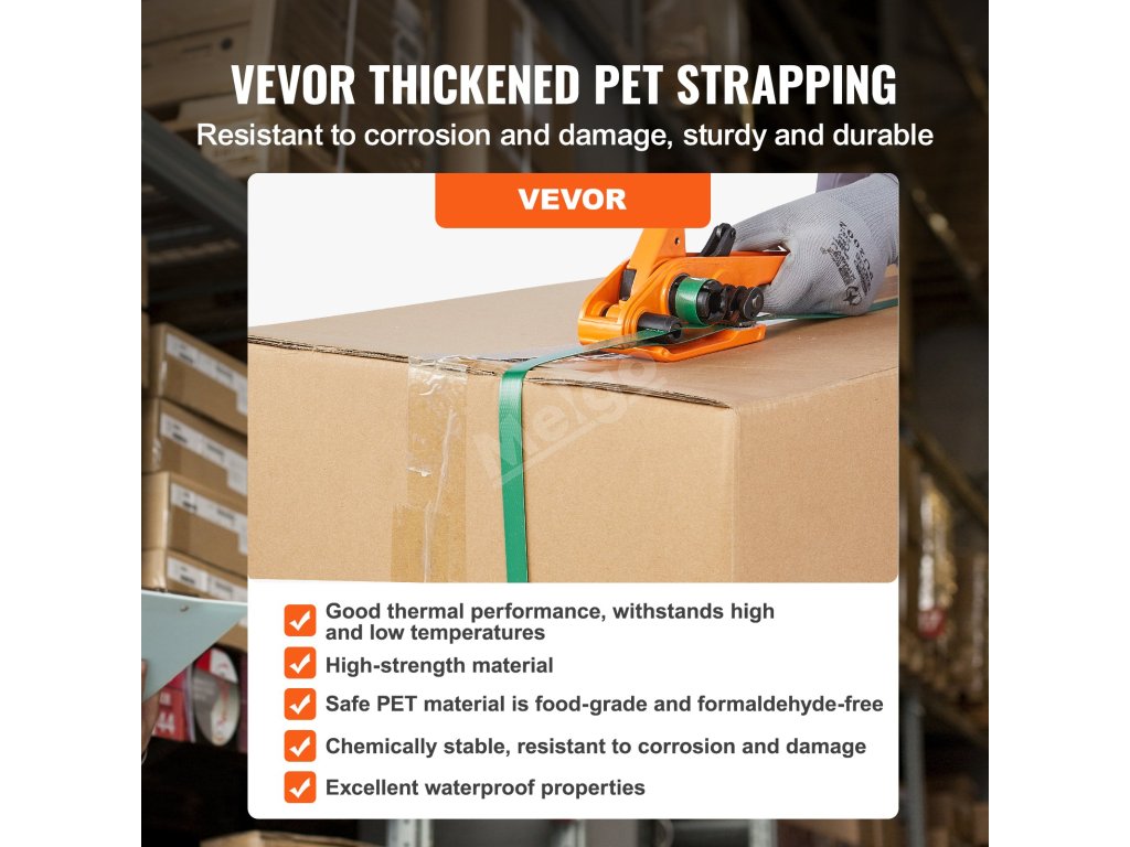 Naše sada pro páskování palet se dodává se zesíleným páskovacím pásem, který je připraven zvládnout velké náklady. Je pevná, odolná vůči UV záření a chemikáliím.