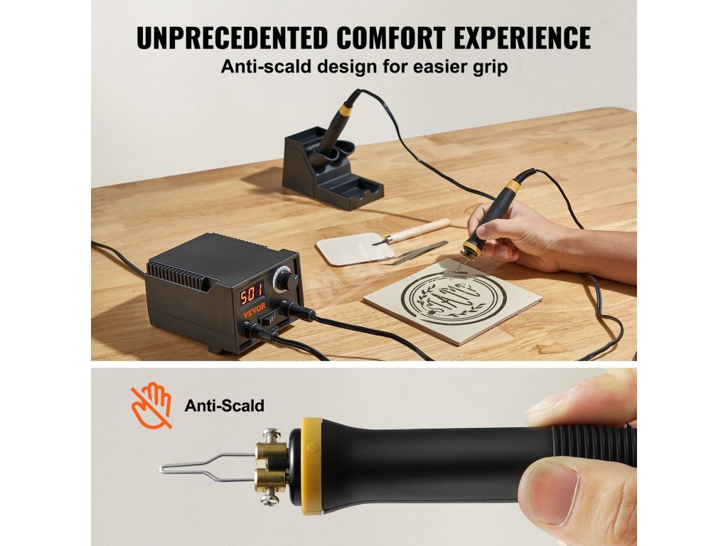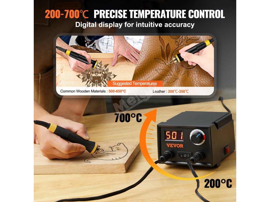 Zapomeňte na odhady teplot! Naše pyrografická souprava na pálení dřeva je vybavena digitálním displejem, který jasně ukazuje aktuální teplotu a poskytuje vám okamžité informace. Nastavitelný rozsah teplot v rozmezí 200-700 °C zajišťuje přesné nastavení teploty.