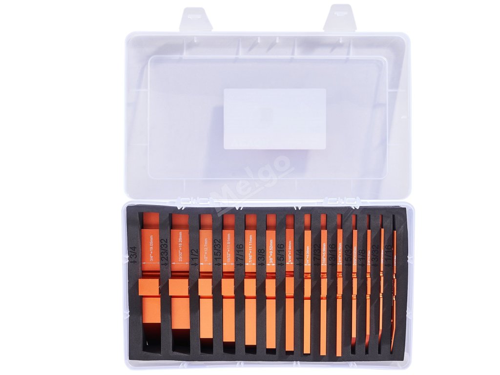 | Velikost sady | 1/16'', 3/32'', 1/8'', 5/32'', 3/16'', 7/32'', 1/4'', 5/16'', 3/8'', 7/16'', 15/32'', 1/2'', 23/32'', 3/4" |
