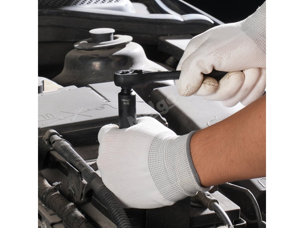 Šestihranná konstrukce nástrčné hlavice vytváří při práci mezeru mezi maticí a okraji, což zabraňuje nadměrnému tření a opotřebení. Odolává větší nárazové síle a účinně odstraňuje šrouby.