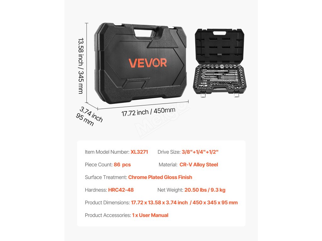 Sada nástrčných hlavic a ráčna 86 díl, 9,5/6,4/12,7 mm, sae/metrická