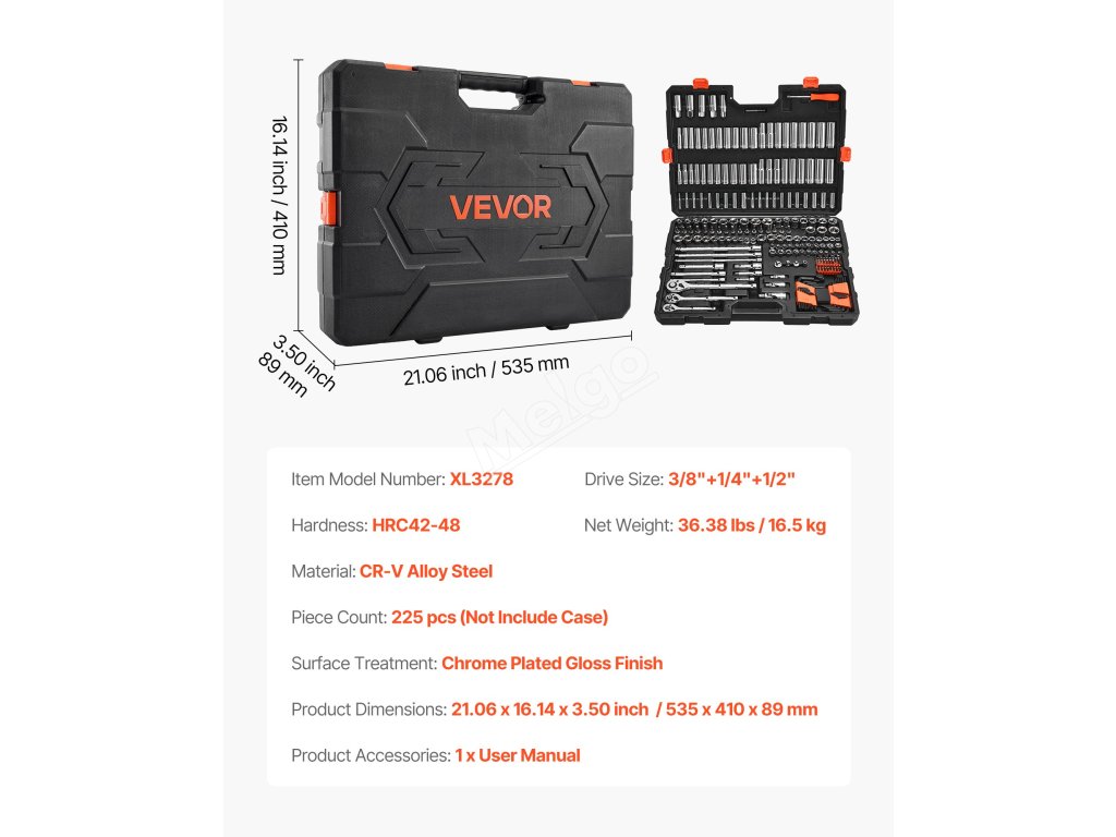 Kufřík s metrickou sadou nástrčných hlavic je navržen pro přenášení a má rozměry 21,06 x 16,14 x 3,50 palce. Jeho kompaktní rozměry se snadno vejdou do stísněných prostor nebo je lze přenášet na cestách, což zajišťuje efektivní práci kdekoli.