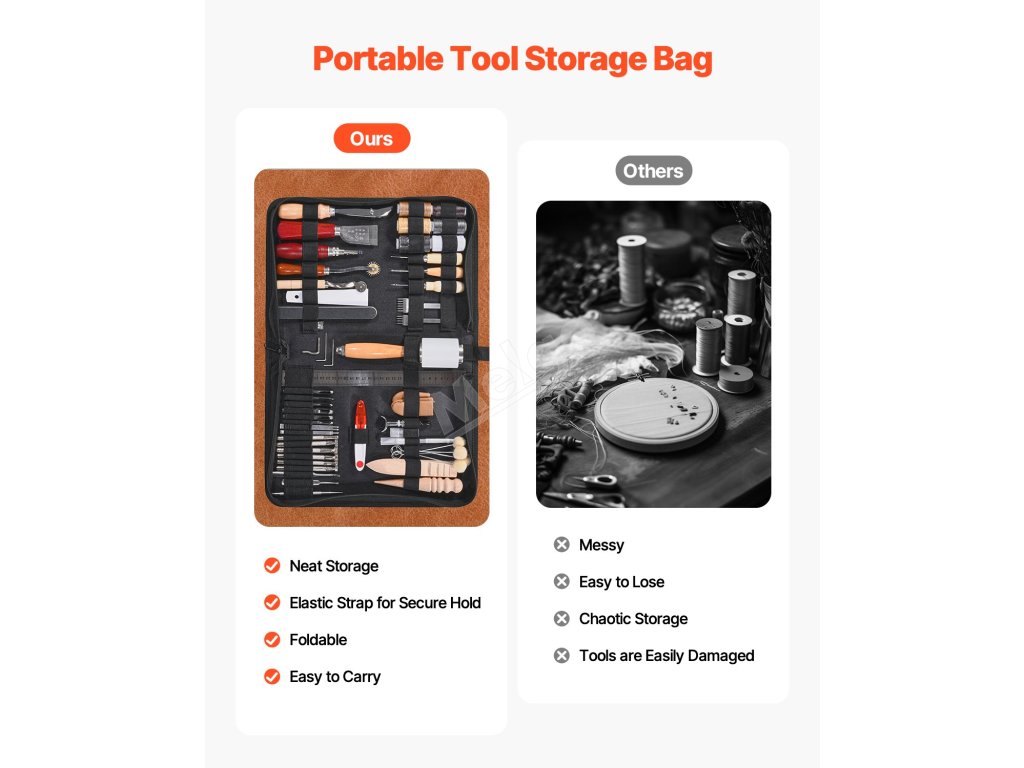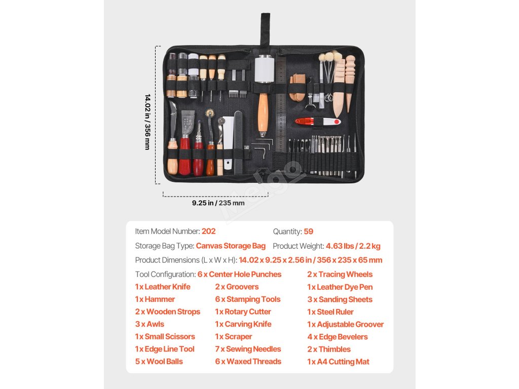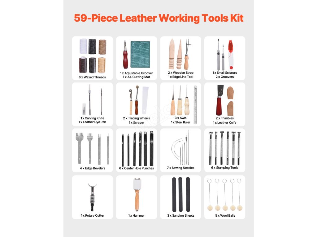 Tato 59dílná sada na zpracování kůže obsahuje vše, co potřebujete k děrování, řezání, šití a vyřezávání. Je vyrobena z vysoce kvalitních materiálů pro dlouhou životnost a snadné použití. Dodává se také s praktickou úložnou taškou, abyste měli nářadí přehledně uspořádané a snadno se přenášelo.