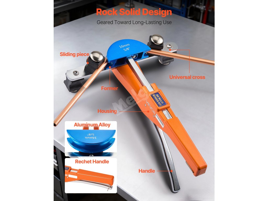 Tato ruční ohýbačka trubek s ráčnou se dodává se 7 maticemi, které umožňují přesné ohýbání měděných a hliníkových trubek o průměru 6 až 22 mm (1/4" až 7/8"). S úhly ohybu od 0° do 90° je ideální pro instalaci klimatizace, opravy automobilů a domácí použití. Díky kompaktnímu provedení se snadno přenáší a skladuje.